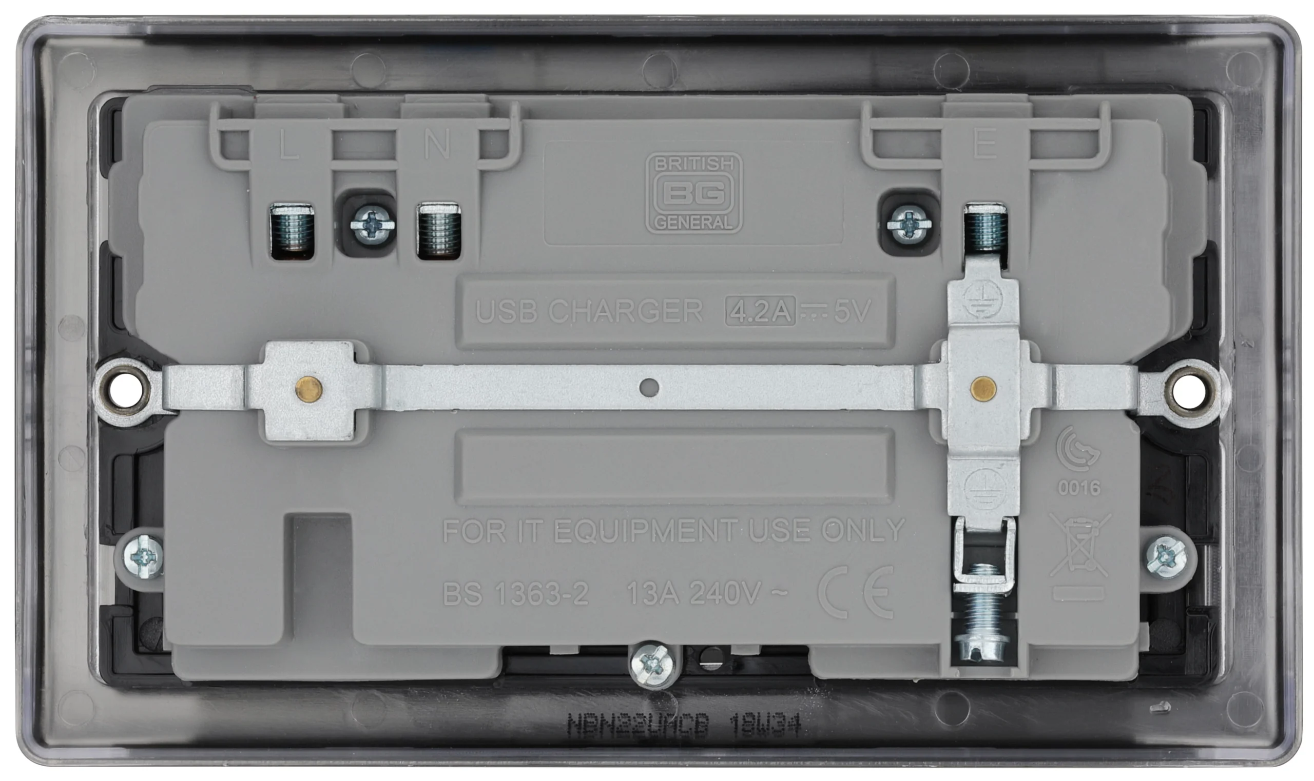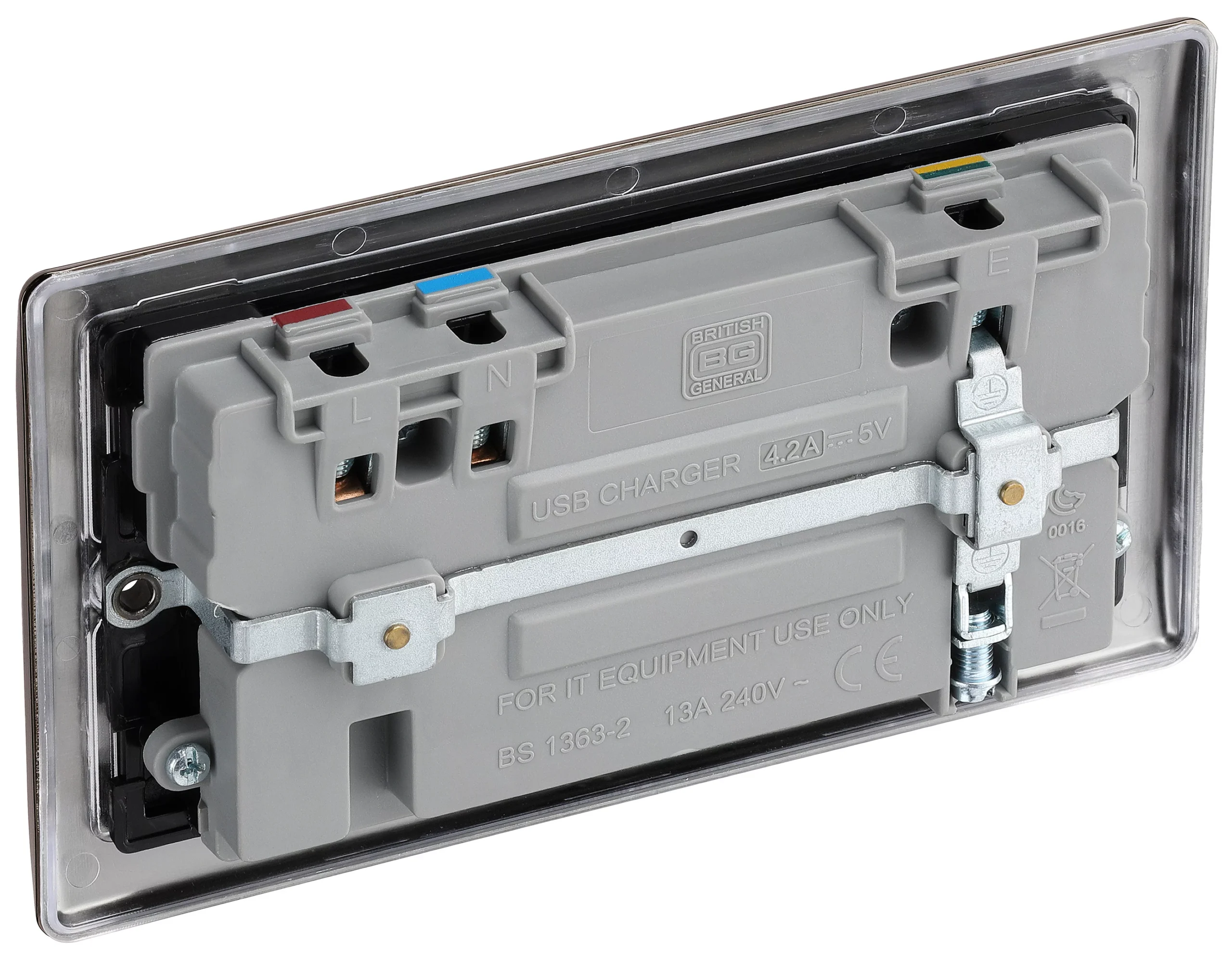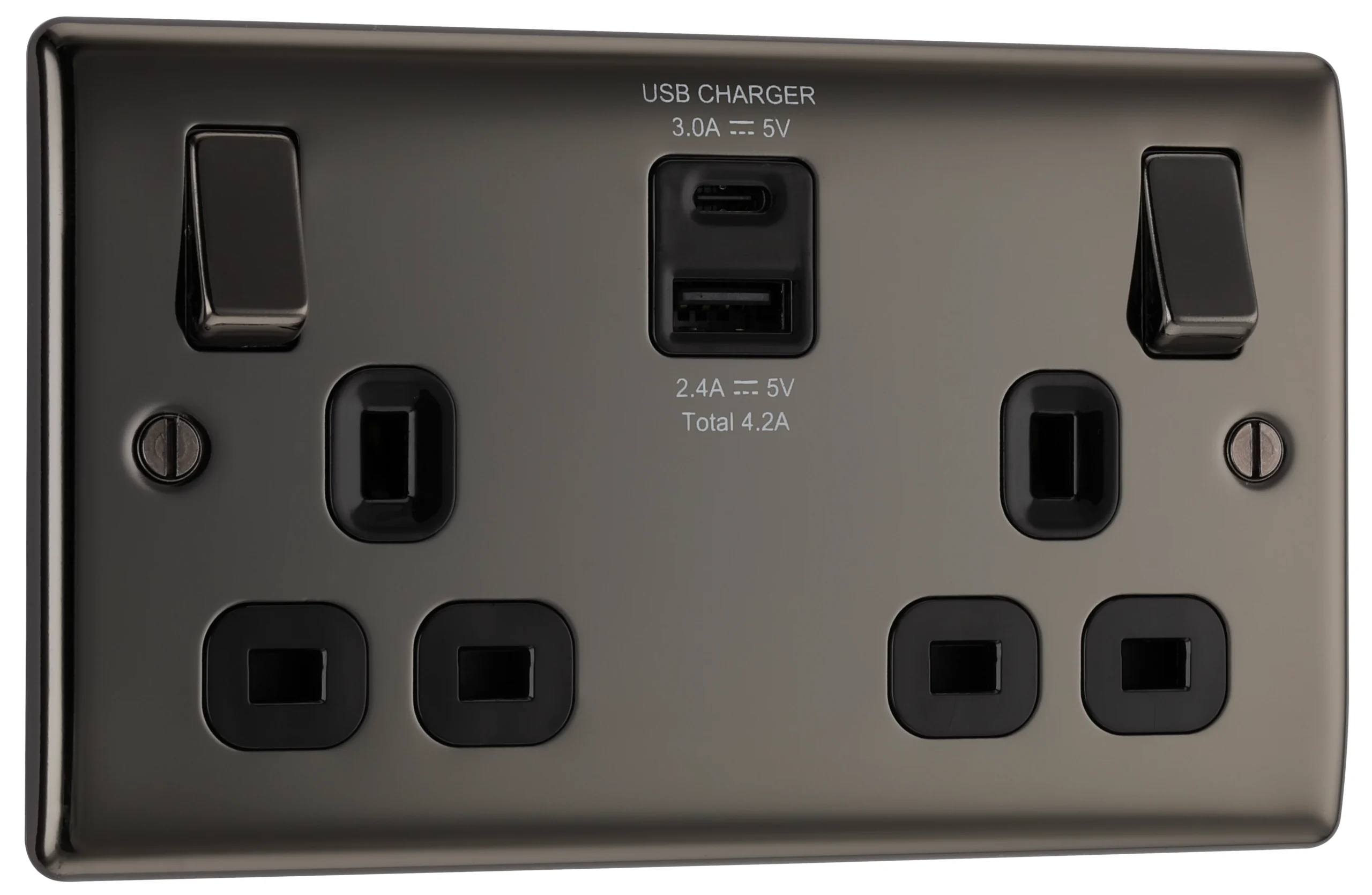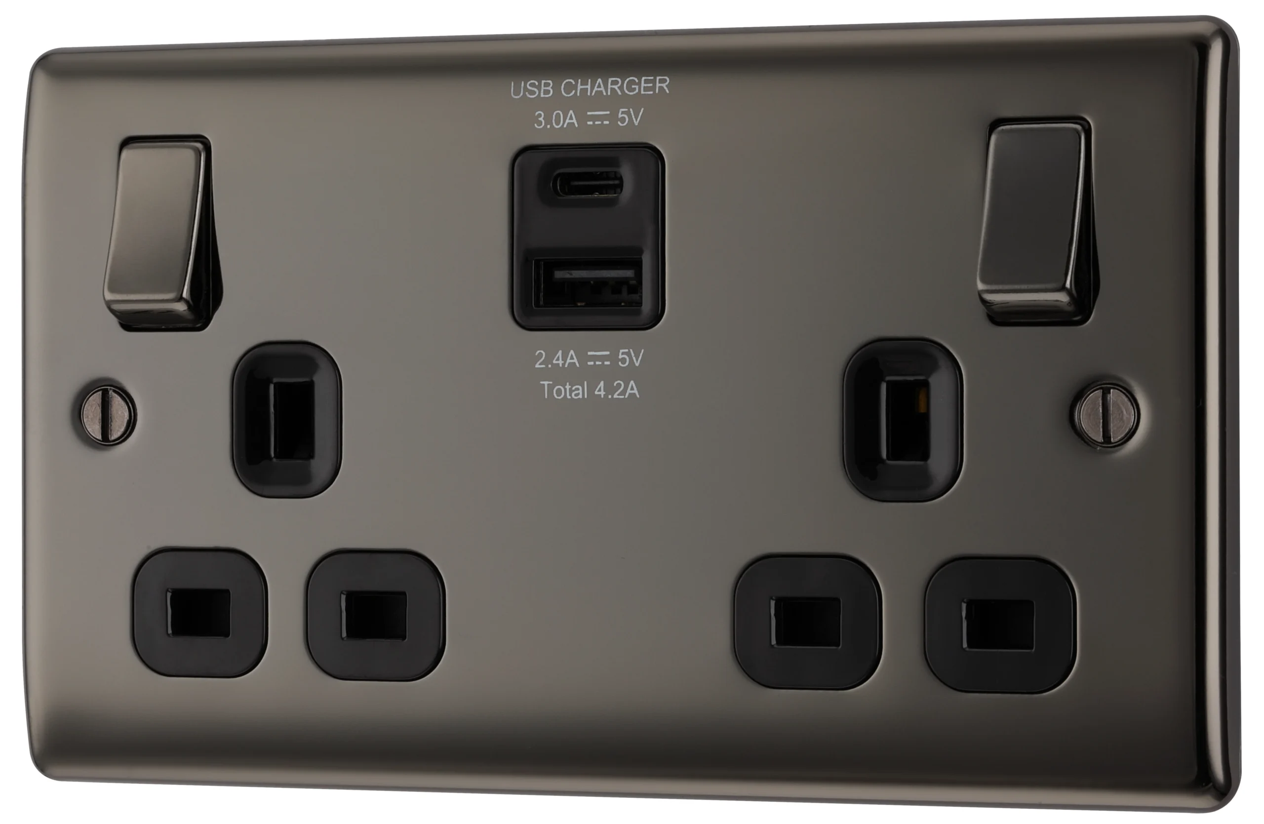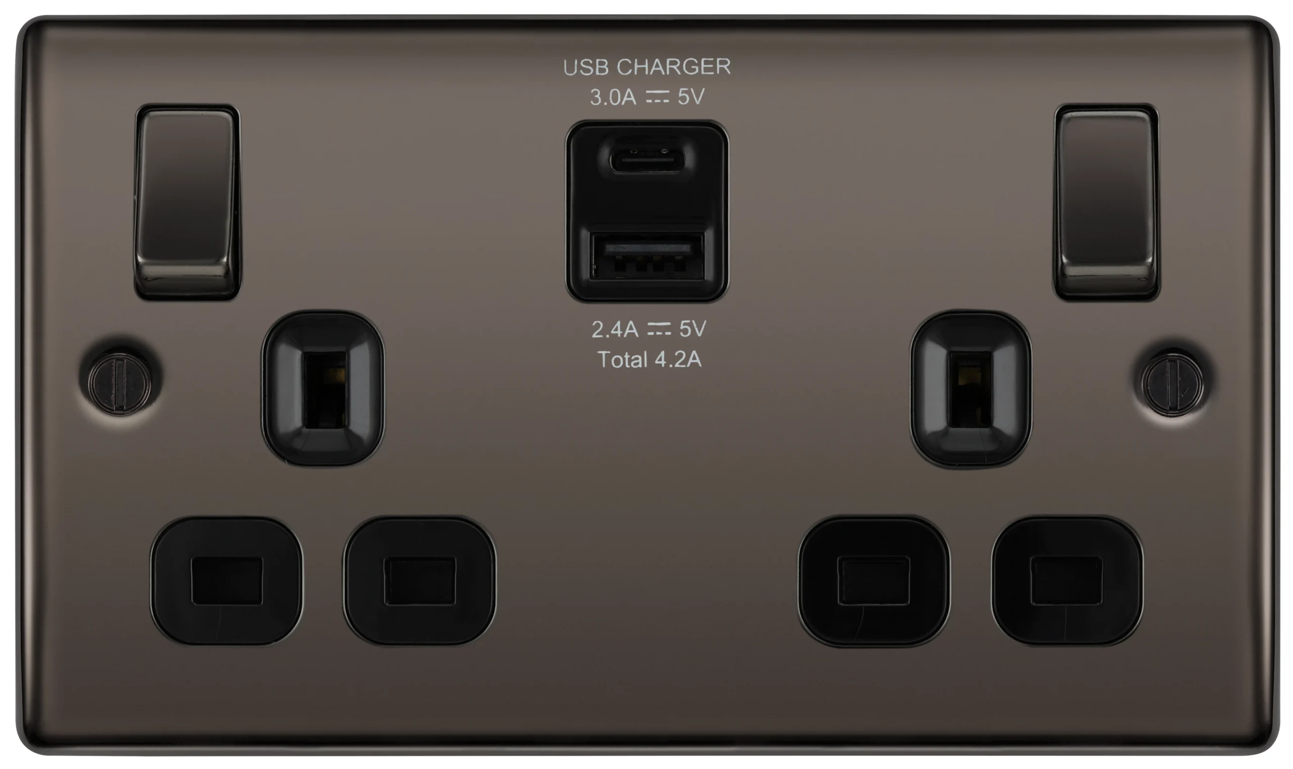 This black nickel finish 13A switched double power socket from British General comes with 1 x USB A and 1 x USB C charging ports, allowing you to plug in electrical devices and charge mobile devices simultaneously without having to sacrifice a power socket.