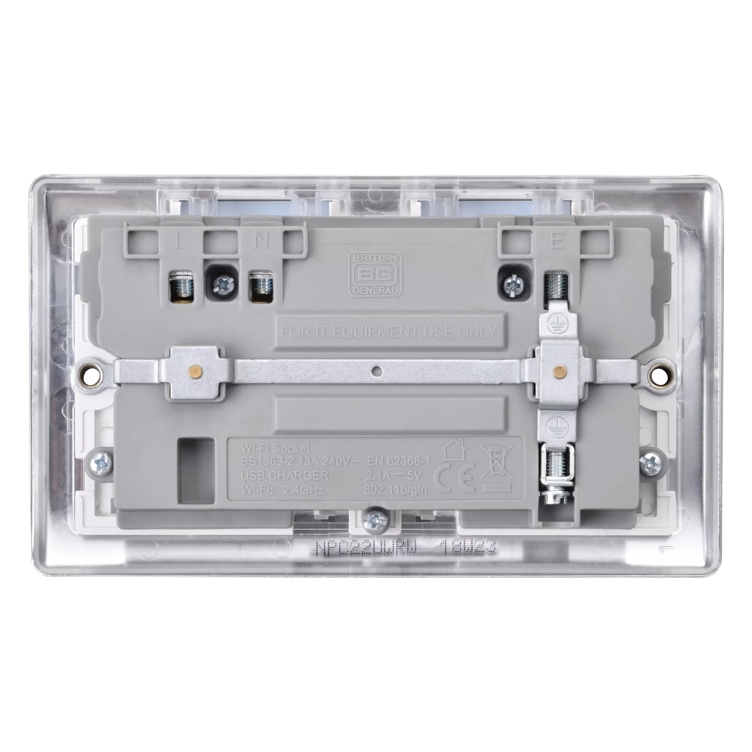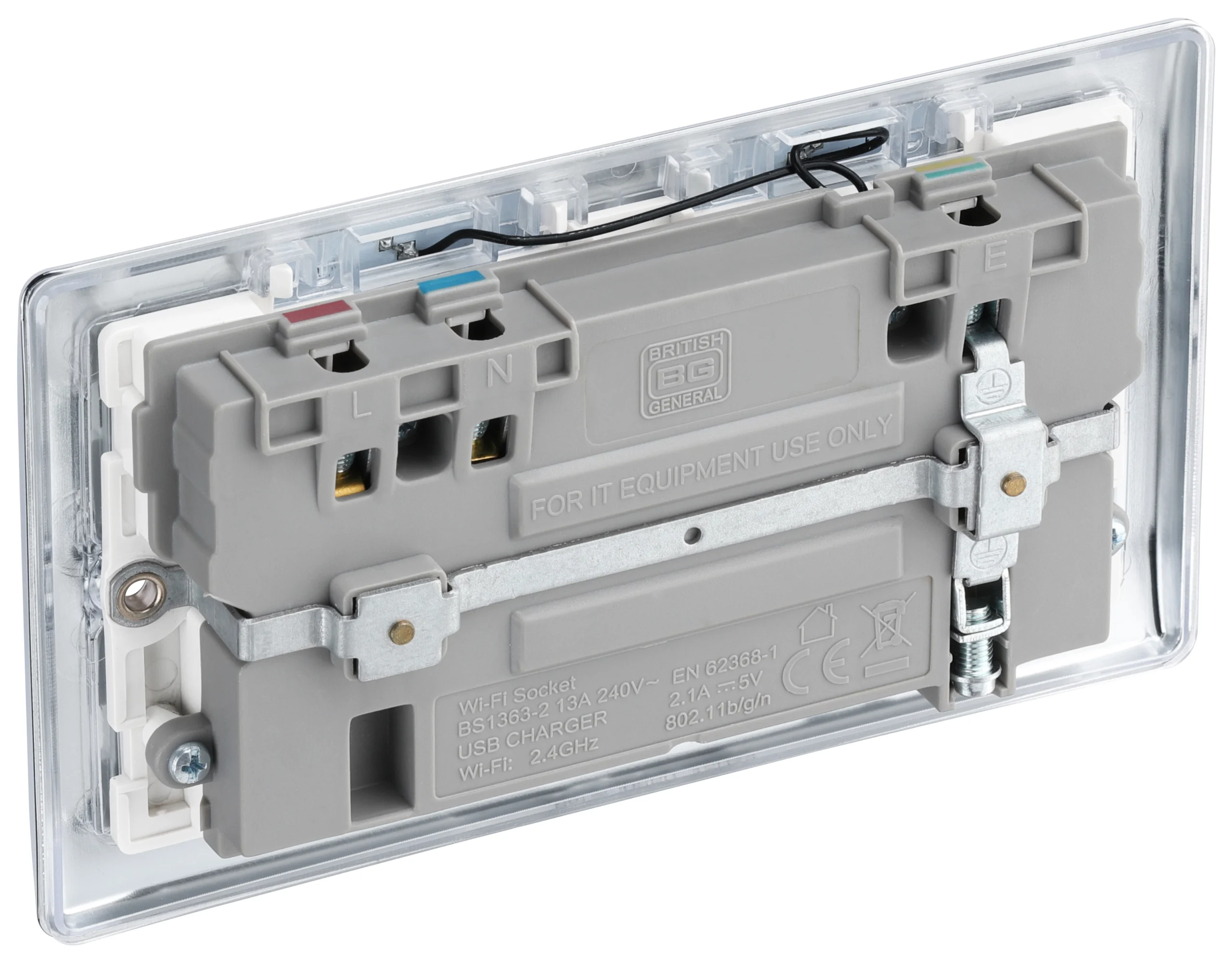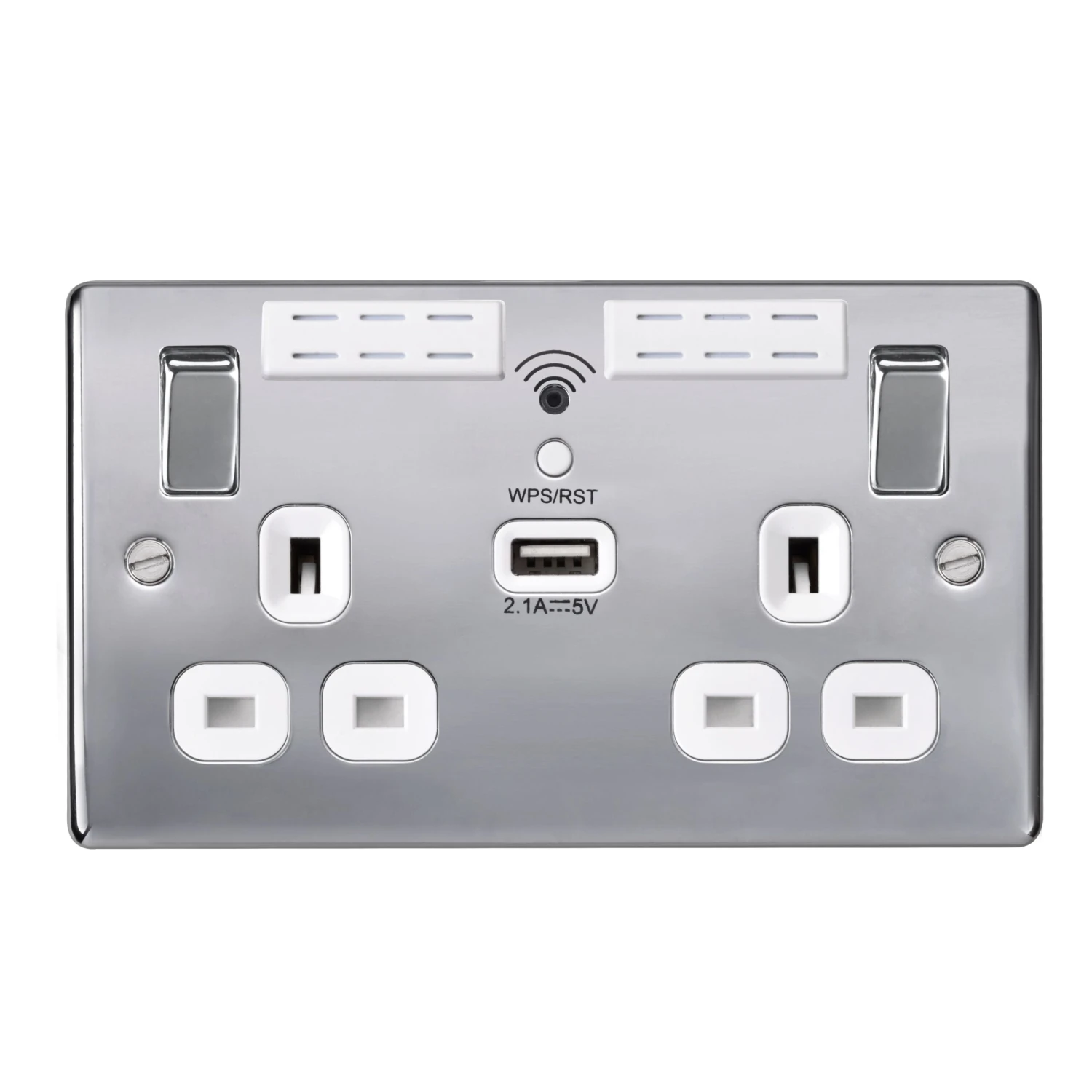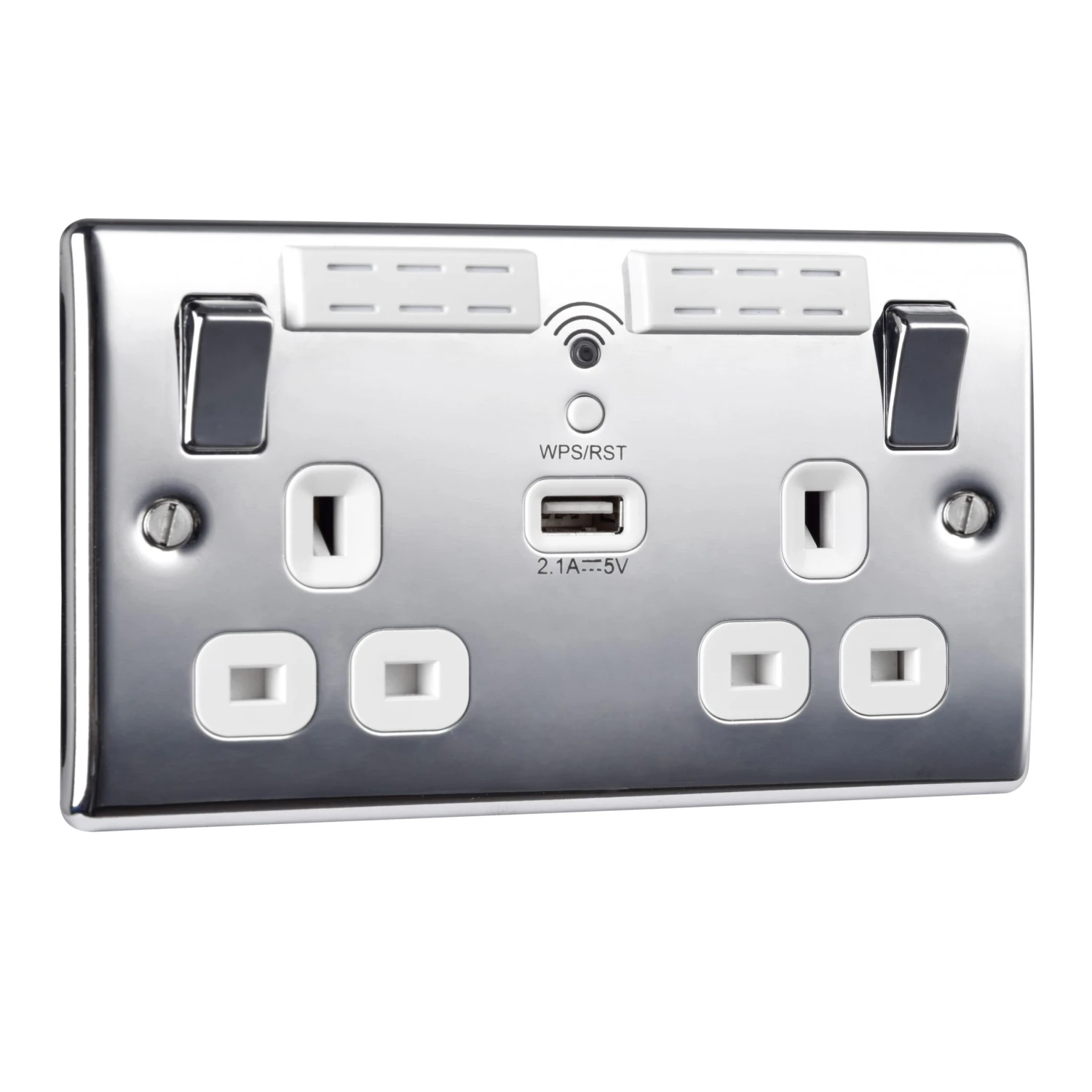 This polished chrome finish 13A double power socket with integrated Wifi Extender from British General will eliminate dead spots and expand your Wi-Fi coverage.