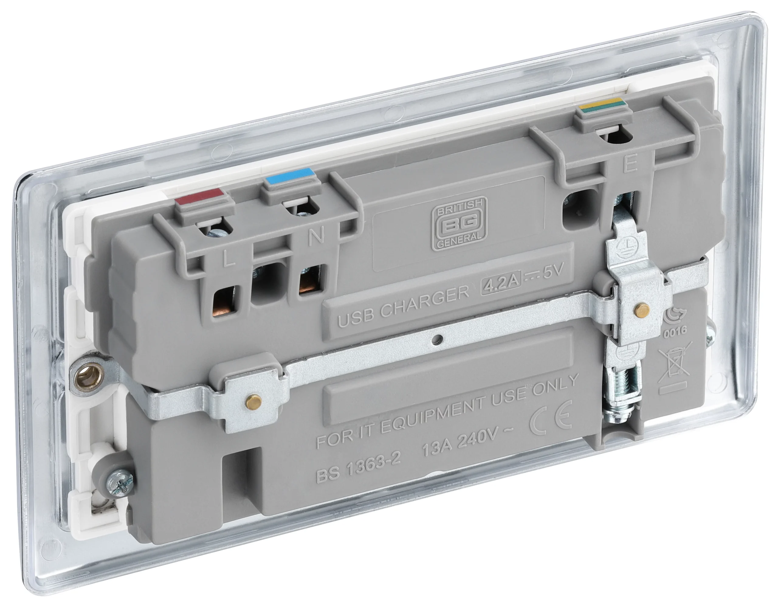 This polished chrome finish 13A switched double power socket from British General comes with 1 x USB A and 1 x USB C charging ports, allowing you to plug in electrical devices and charge mobile devices simultaneously without having to sacrifice a power socket.
