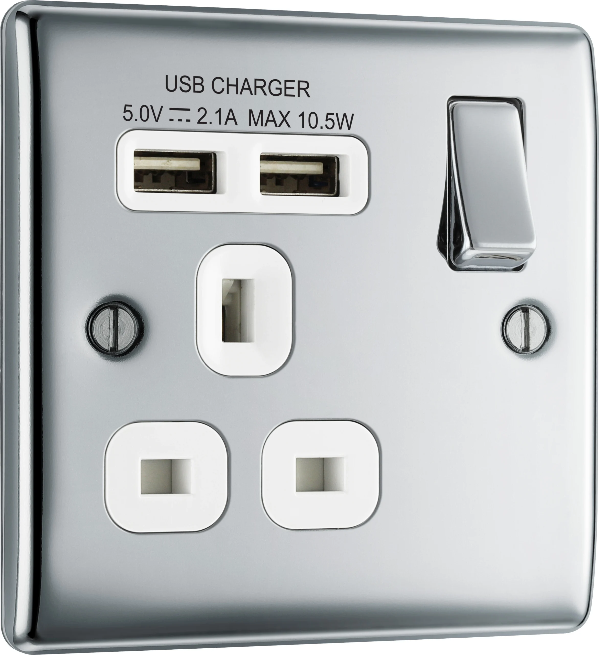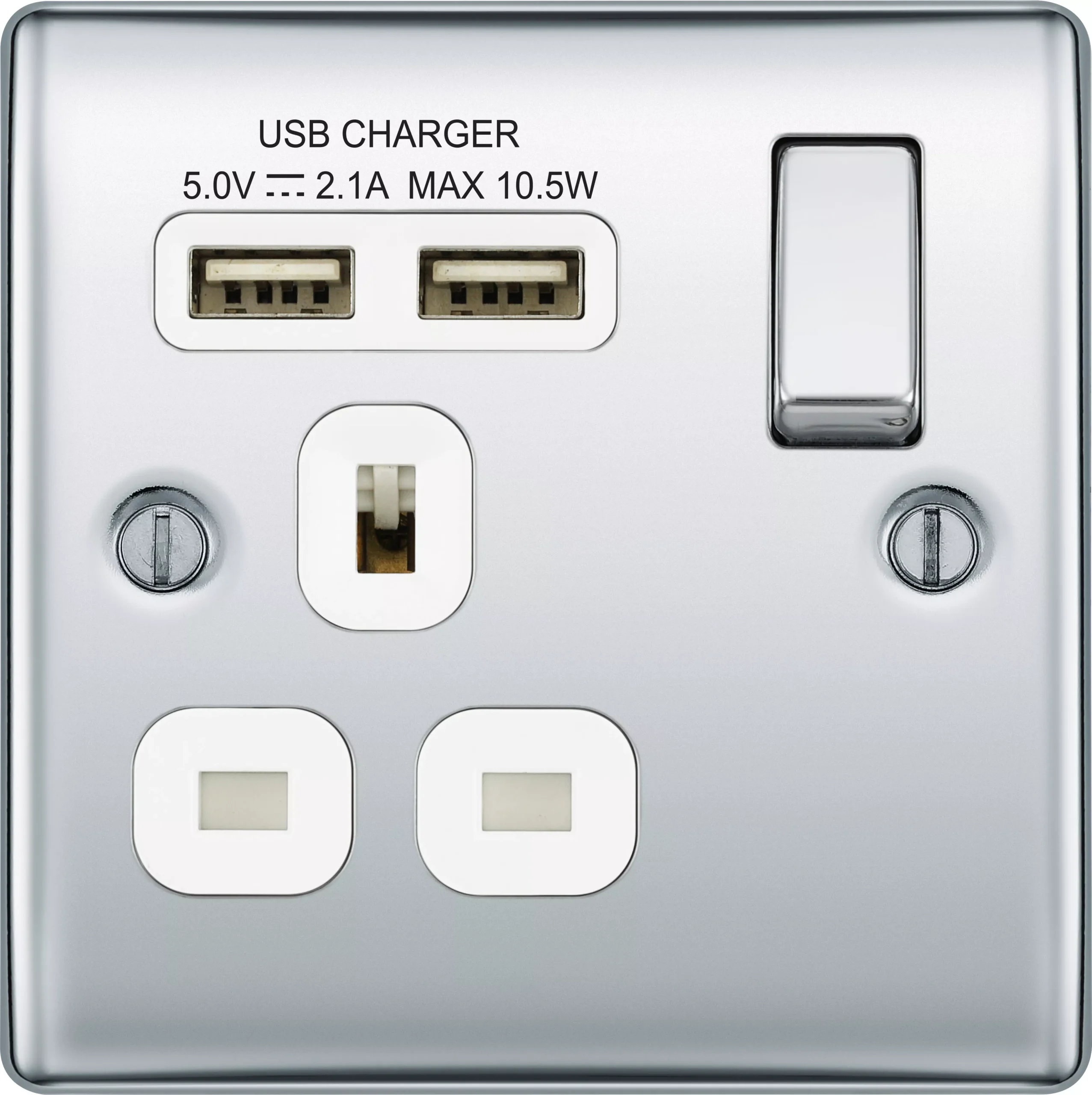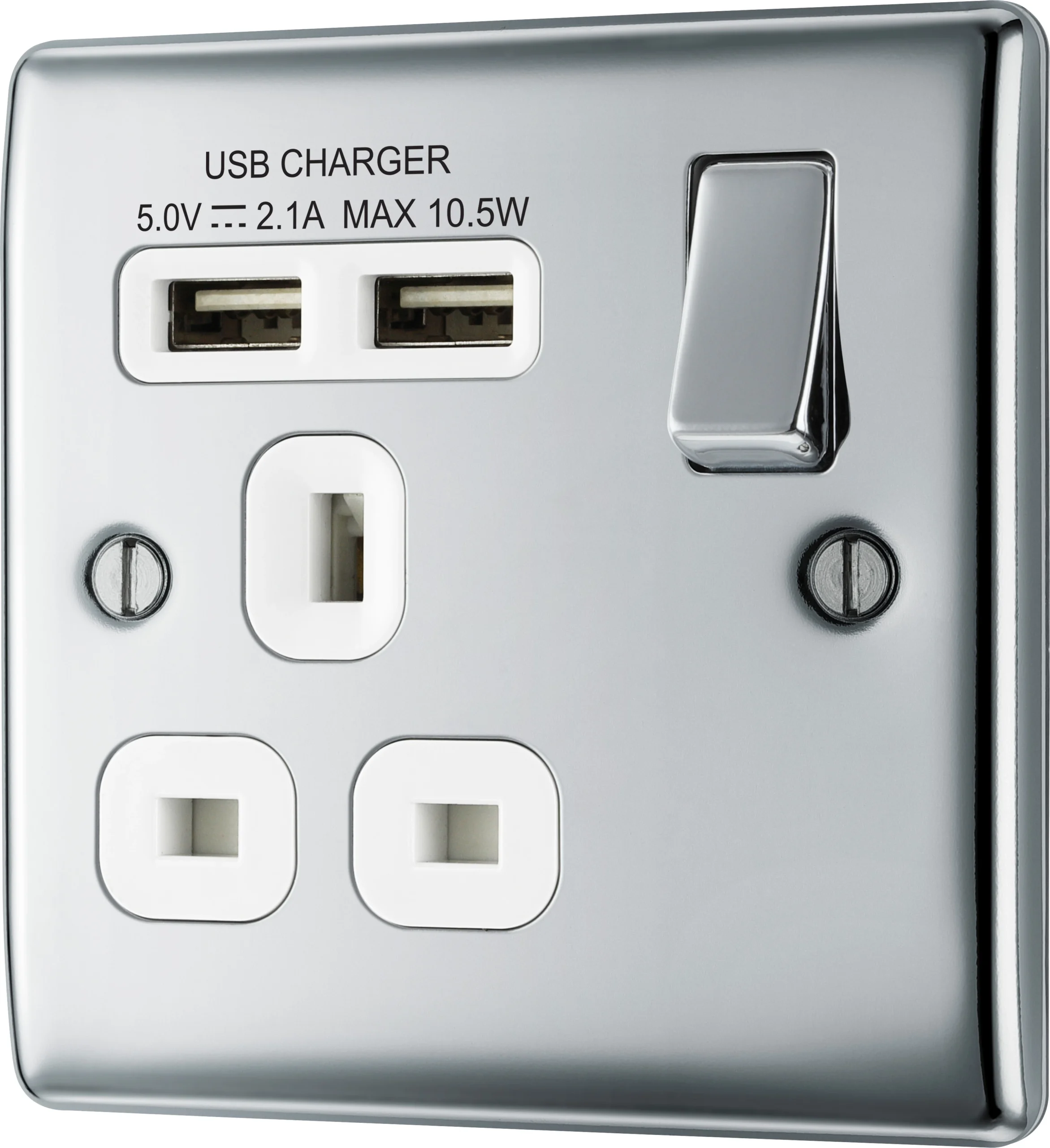This polished chrome finish 13A switched single power socket from British General comes with 2 USB charging ports, allowing you to plug in an electrical device and charge mobile devices simultaneously without having to sacrifice a power socket.