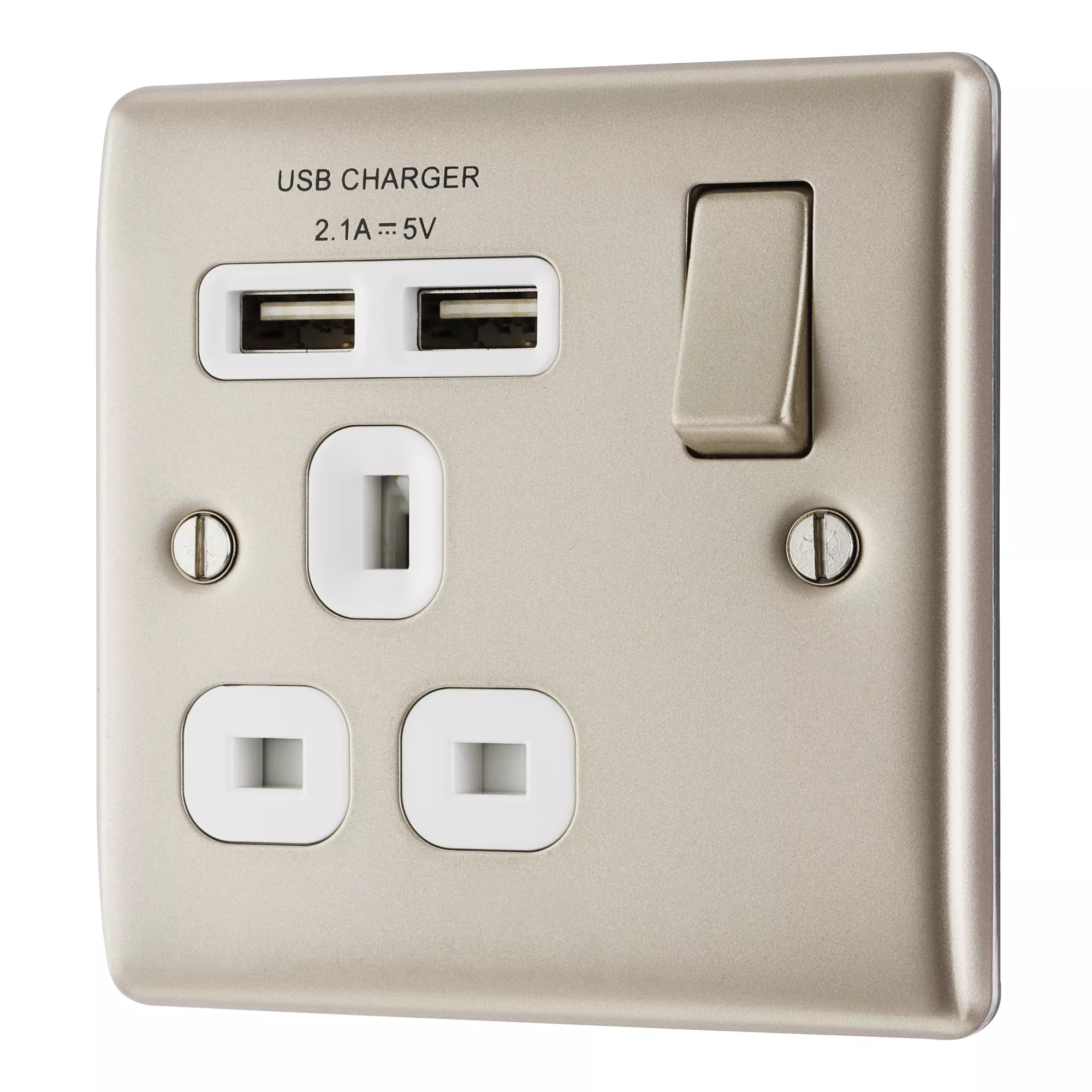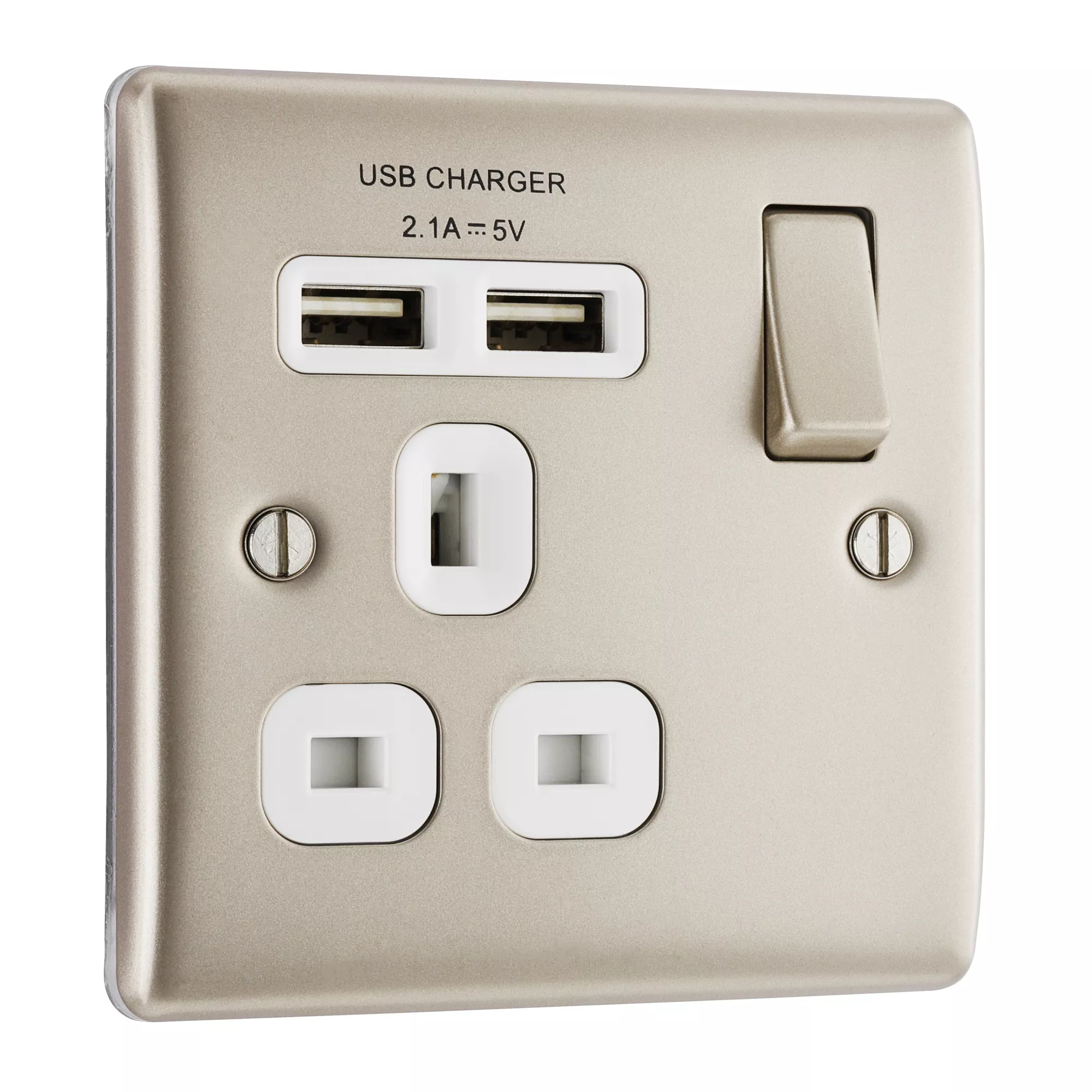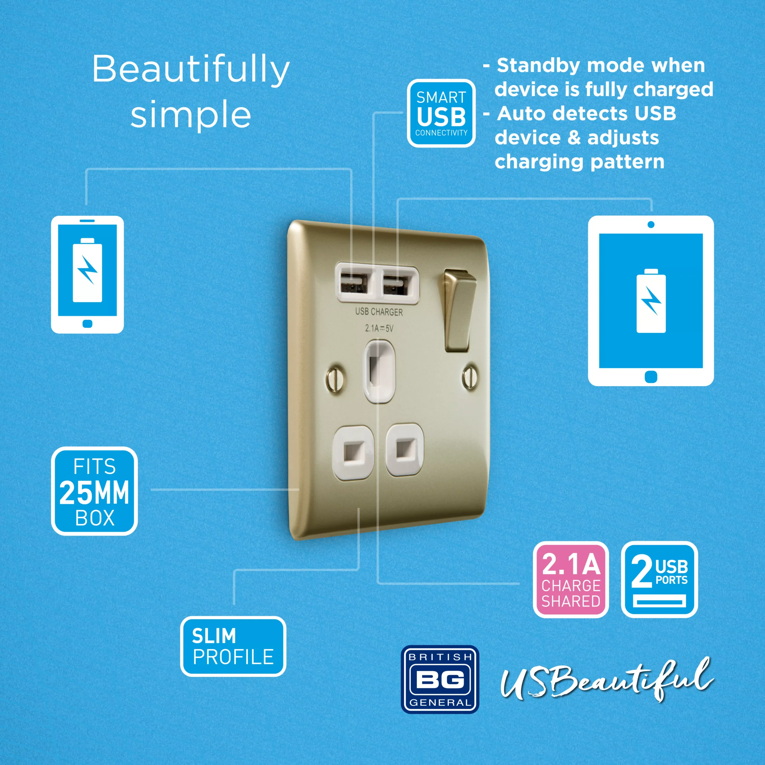 This pearl nickel finish 13A switched single power socket from British General comes with 2 USB charging ports, allowing you to plug in an electrical device and charge mobile devices simultaneously without having to sacrifice a power socket.
