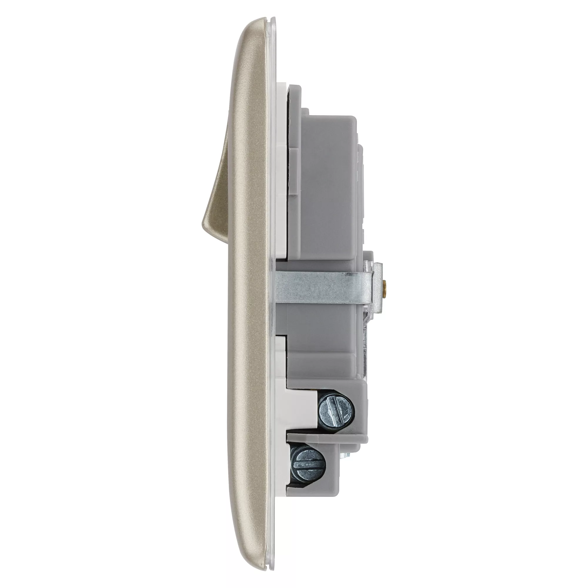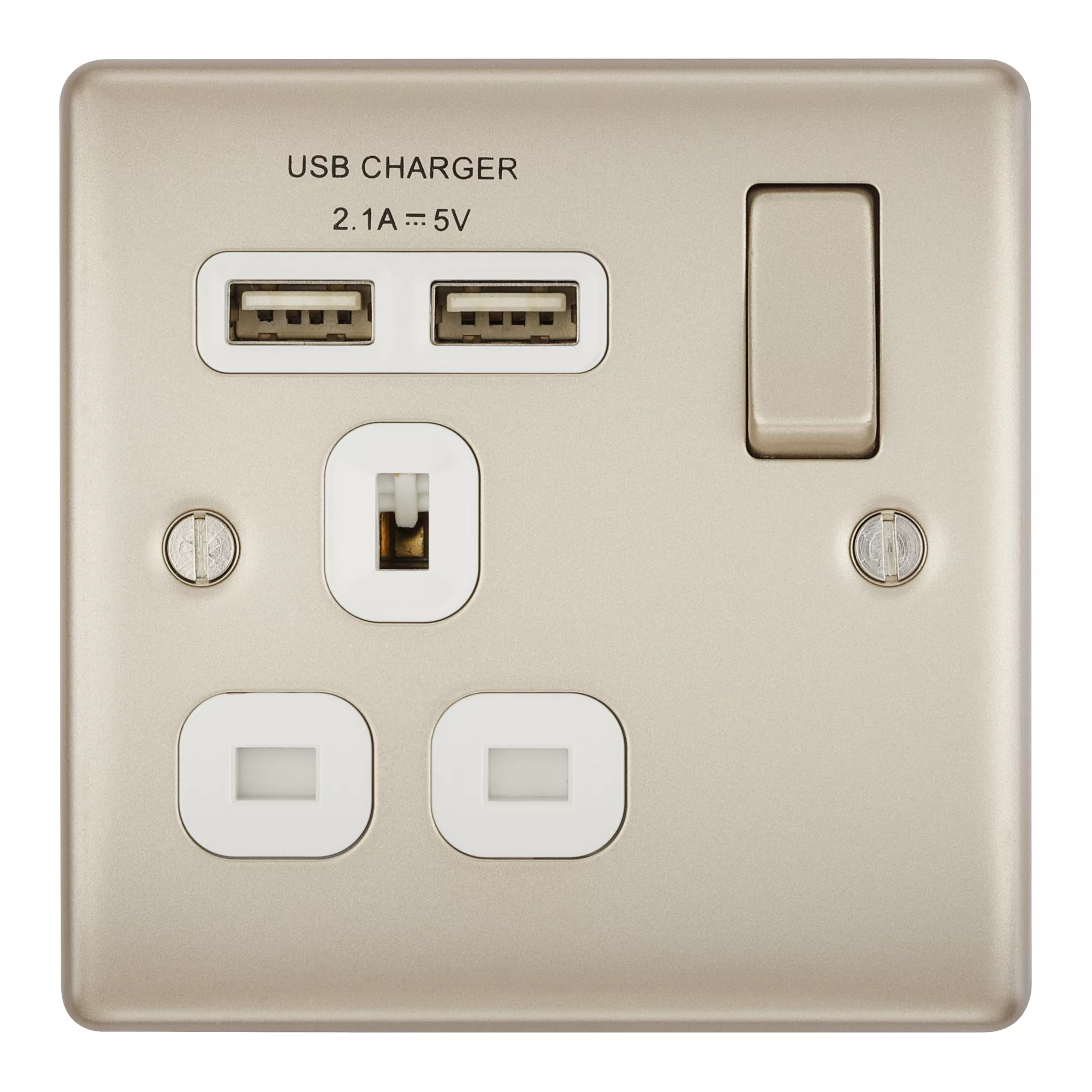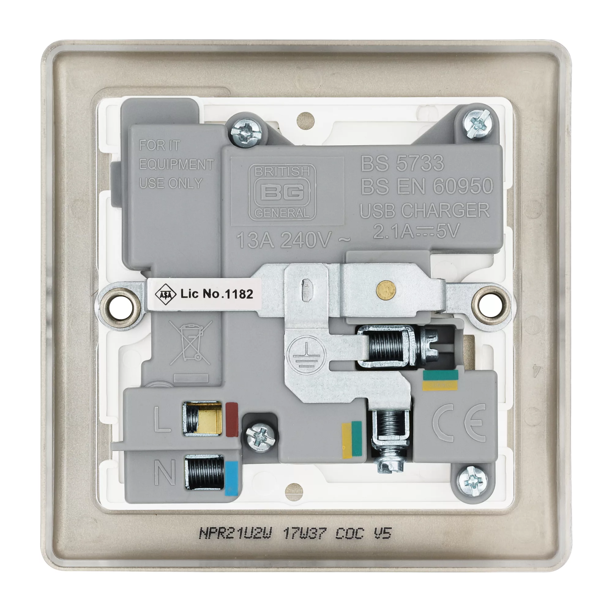 This pearl nickel finish 13A switched single power socket from British General comes with 2 USB charging ports, allowing you to plug in an electrical device and charge mobile devices simultaneously without having to sacrifice a power socket.