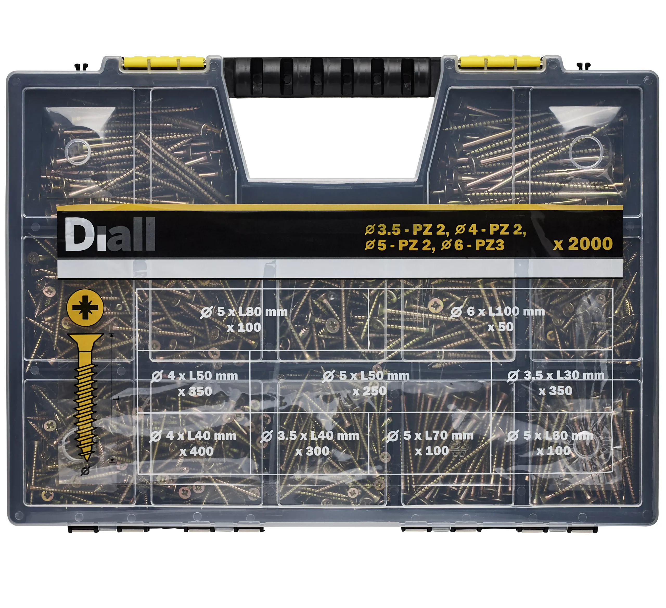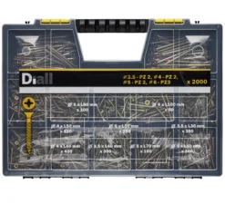 This pack of 2000 assorted yellow zinc plated double countersunk wood screws are constructed from durable steel. Whether you need an 350x (3.5 x 30mm), 350x (3.5 x 40mm), 350x (4 x 40mm), 350x (4 x 50mm), 250x (5 x 50mm), 100x (5 x 60mm), 100x (5 x 70mm), 100x (5 x 80mm) and 50x (6 x 100) screw you will be prepared for the job. Recommended for use on plasterboards. This pack is ideal for a range of DIY projects.