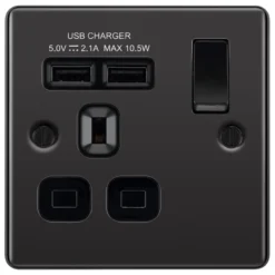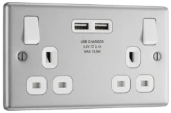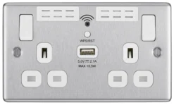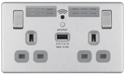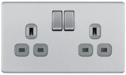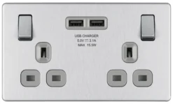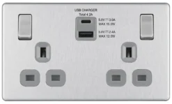 GoodHome Brushed Steel Double 13A Screwless Switched Socket With USB X2 3.1A & Grey Inserts