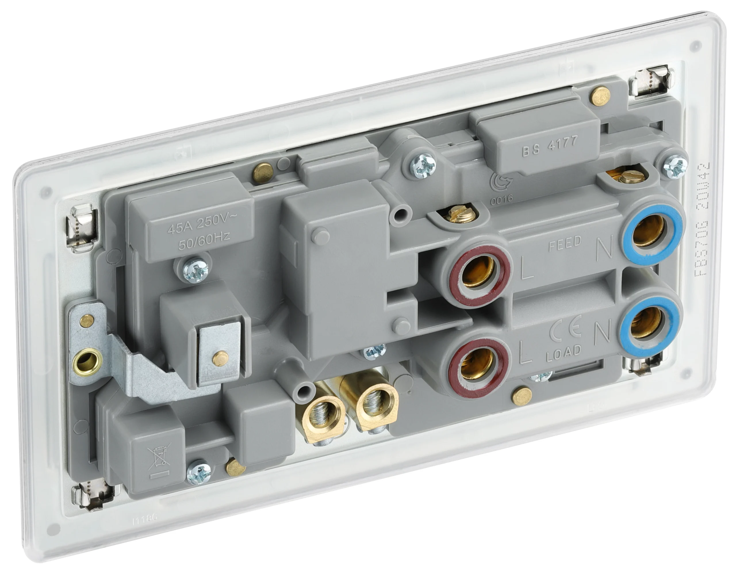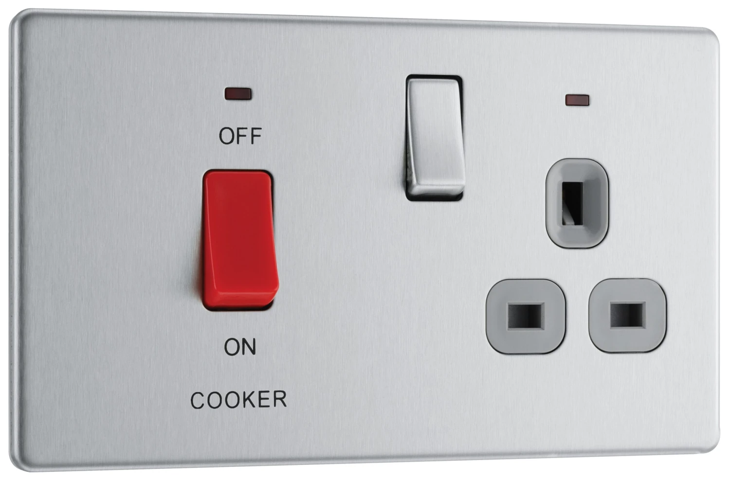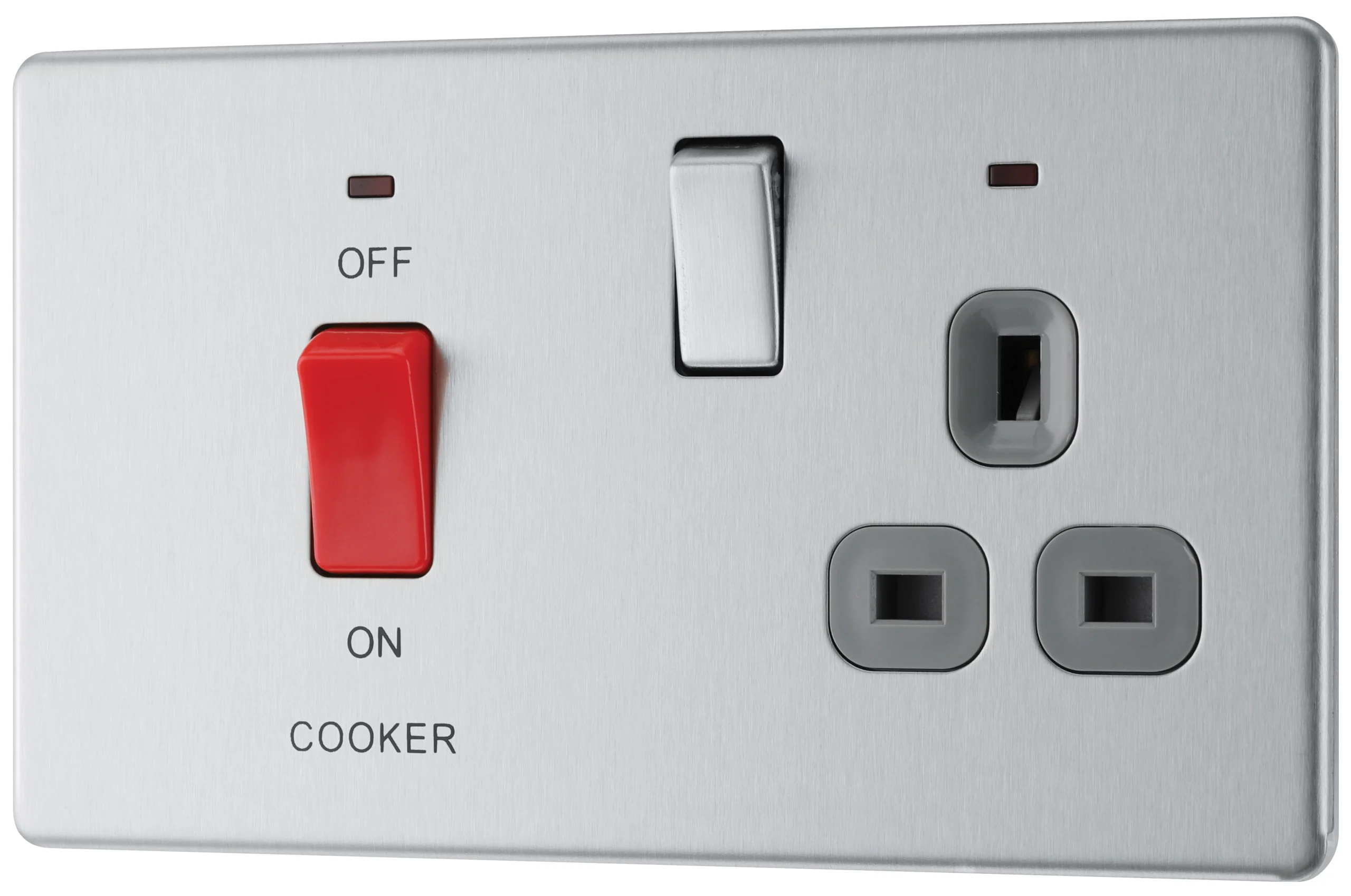 This 45A cooker control unit includes a 13A socket for an additional appliance outlet and has flush LED indicators above the socket and switch. The screwless clip on/off front plate has a brushed steel with an integrated moisture control gasket to protect the metal from tarnishing, whilst the flat profile with rounded edges makes this ideal for modern interiors.