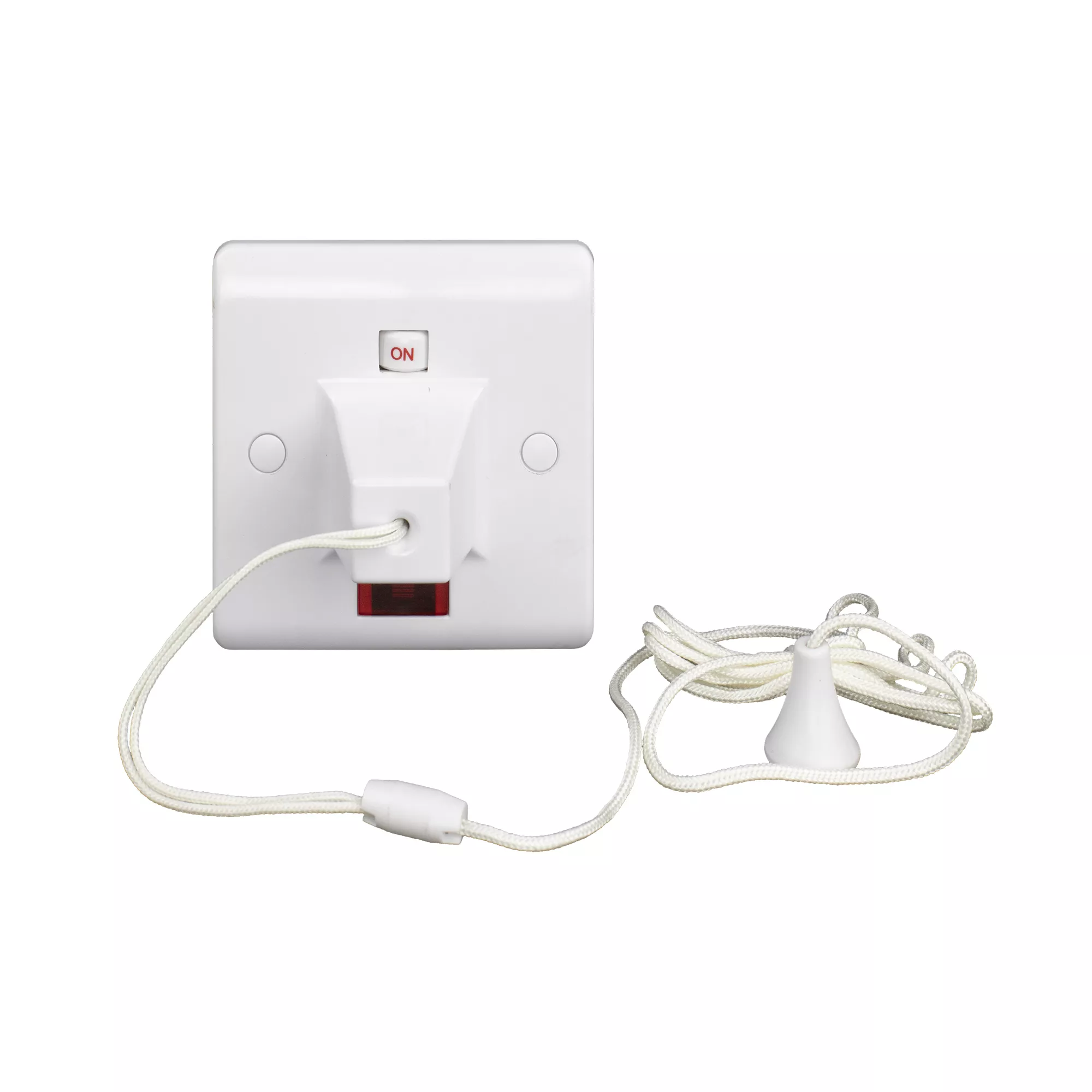 Raised slim profile pull cord switch with white finish and white insert. 1 gang internal switch, ideal for controlling 1 circuit.