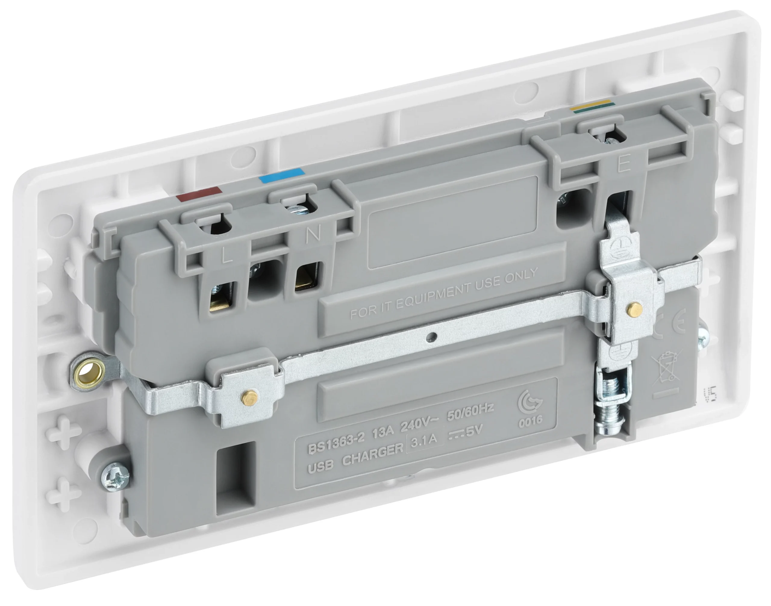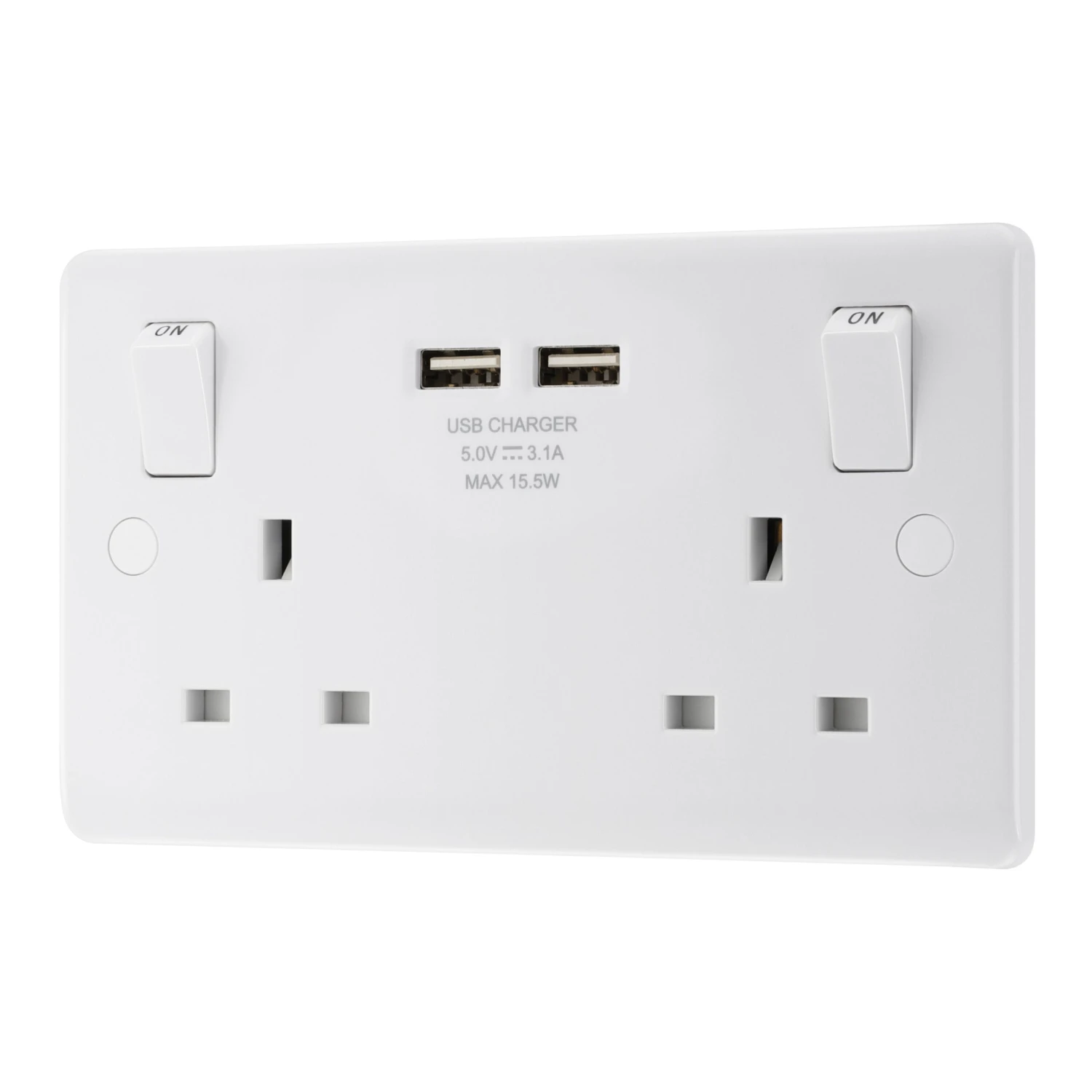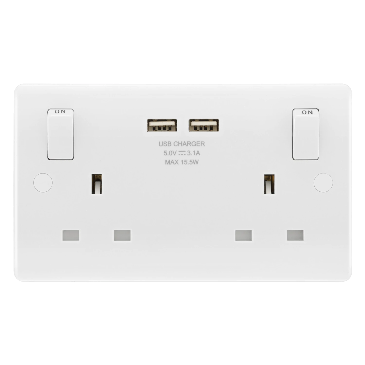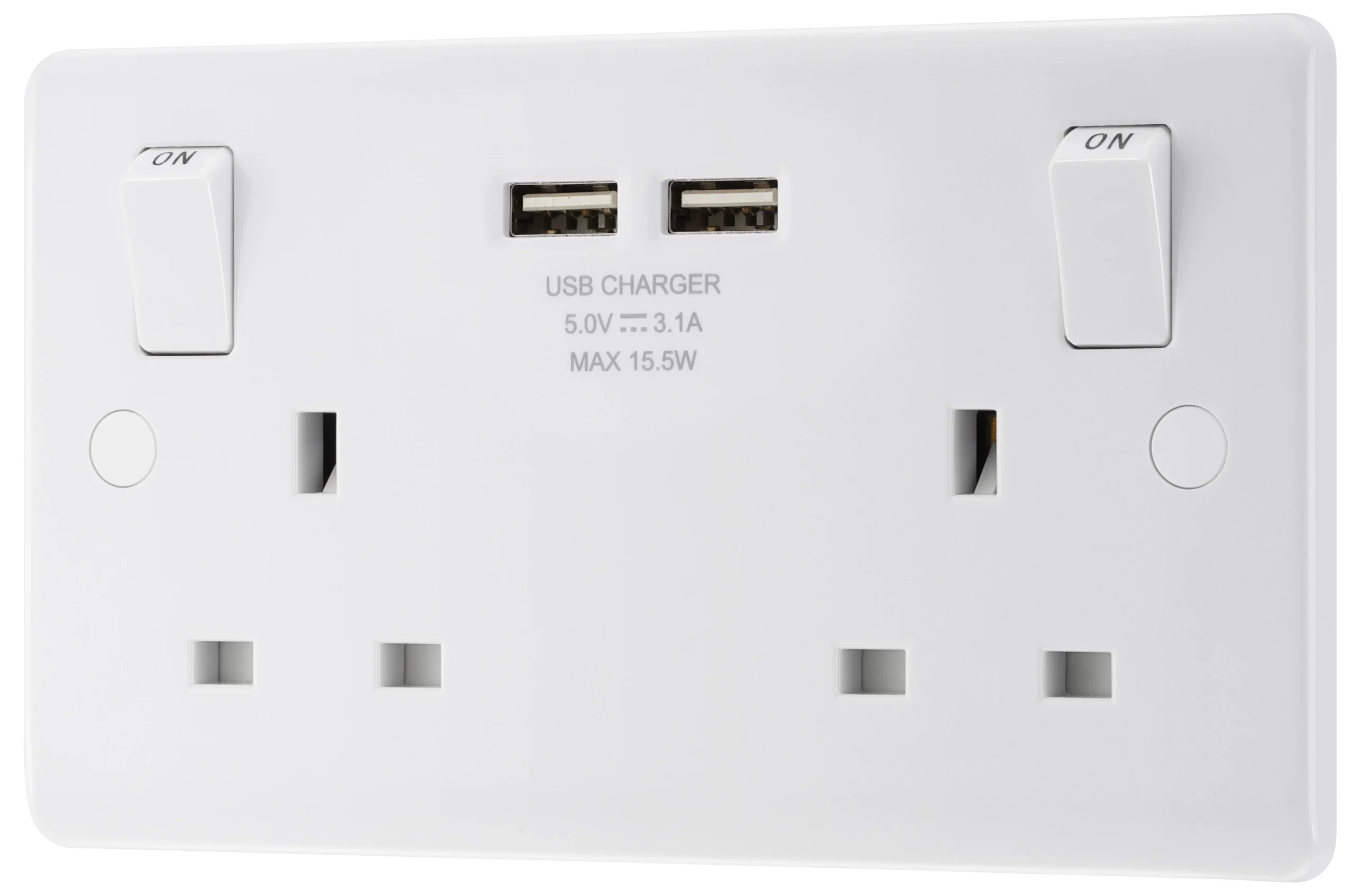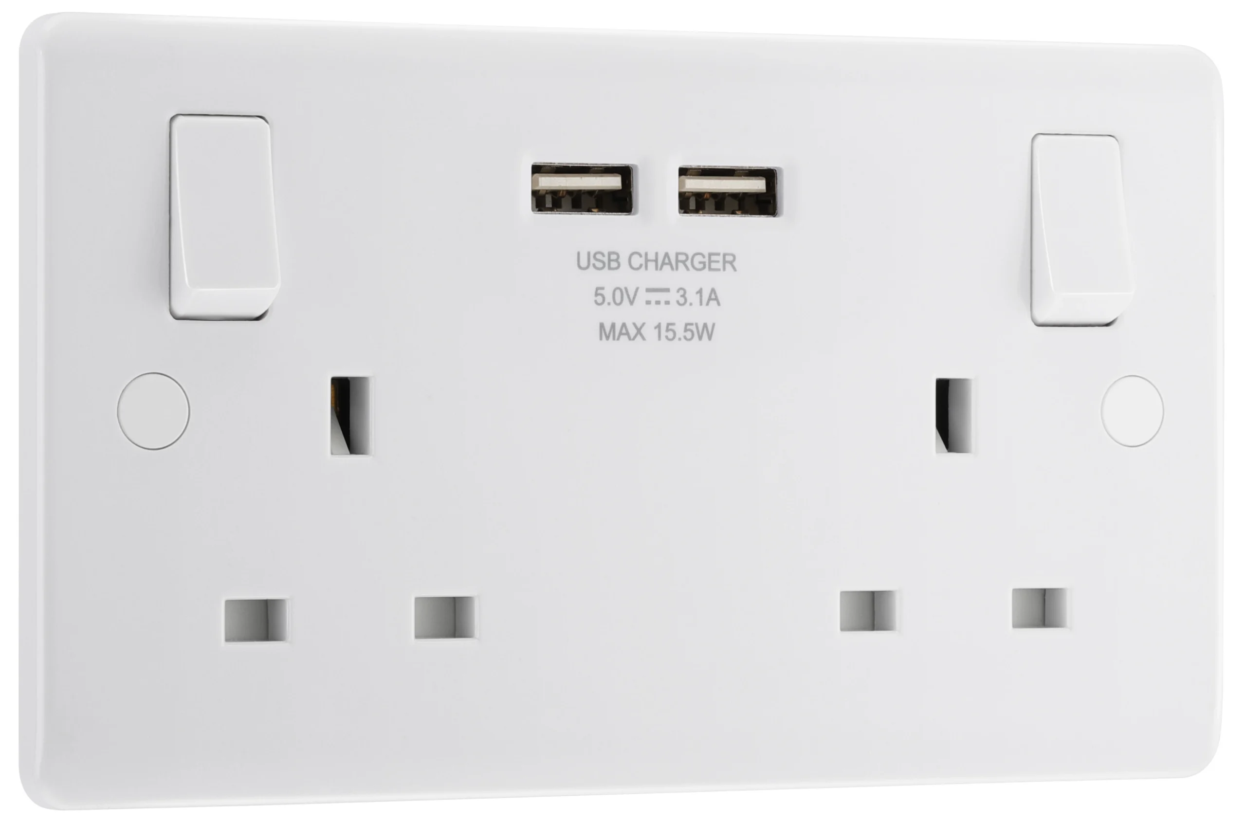 White moulded socket with 2 x USB charging ports. Ideal for charging iPads, iPhones, tablets, mobiles, cameras, MP3s and many more devices.
