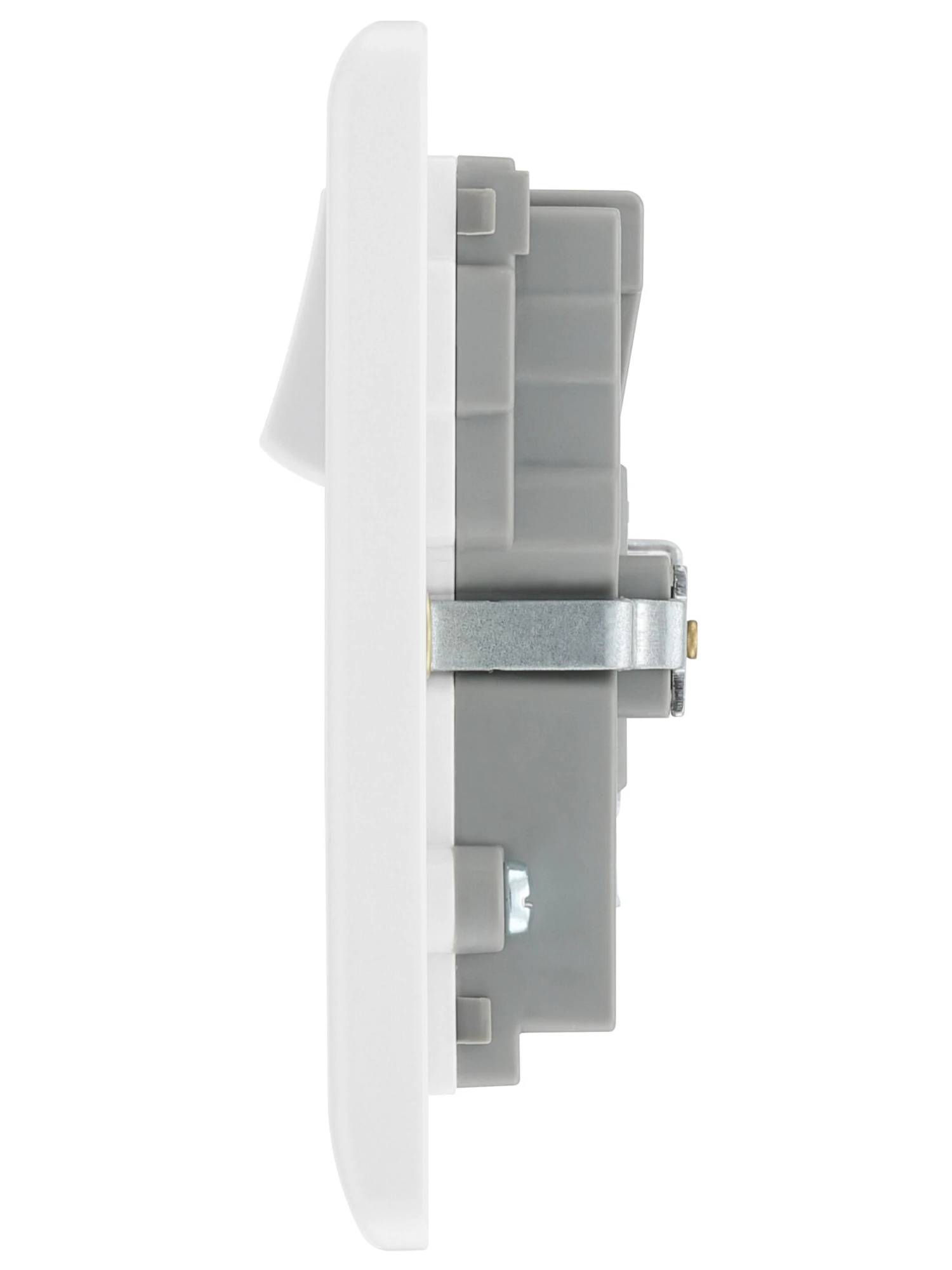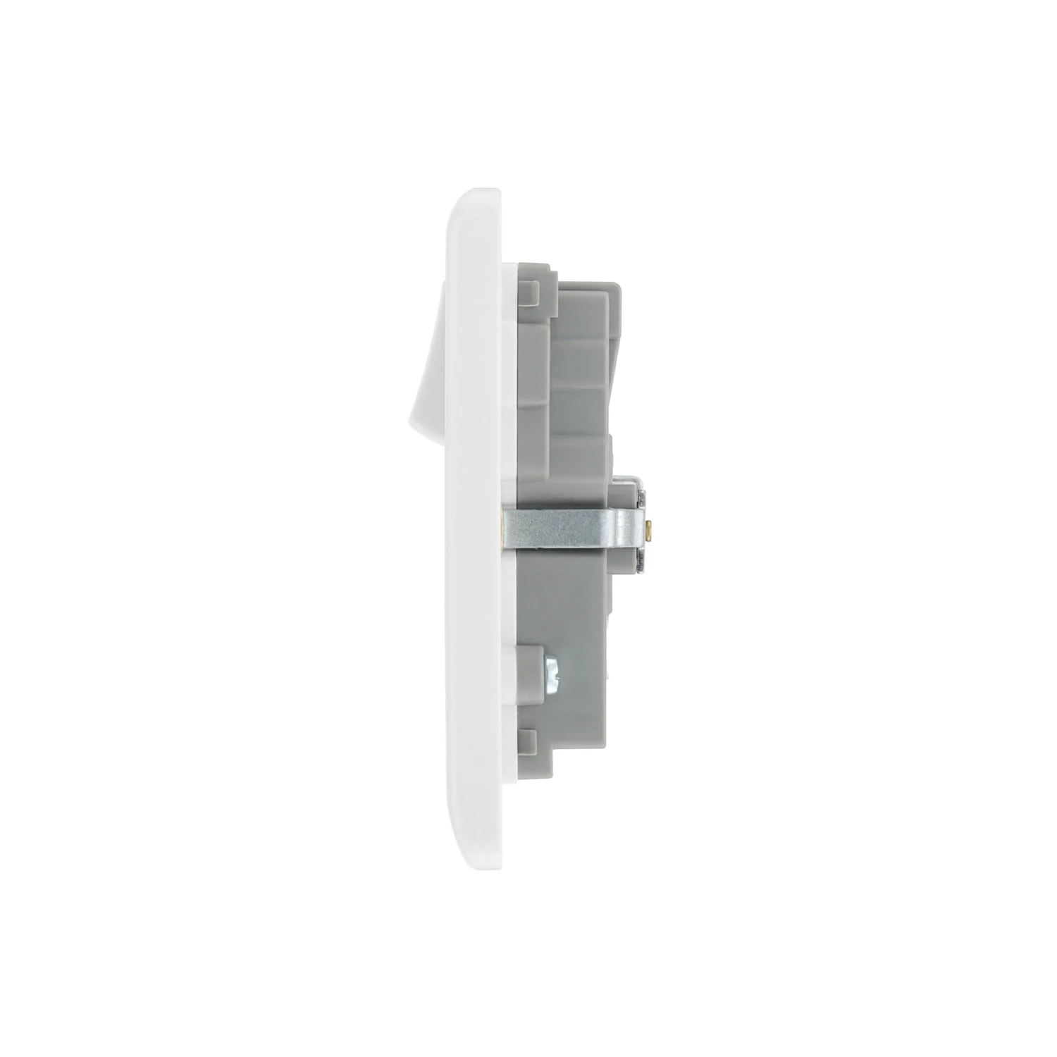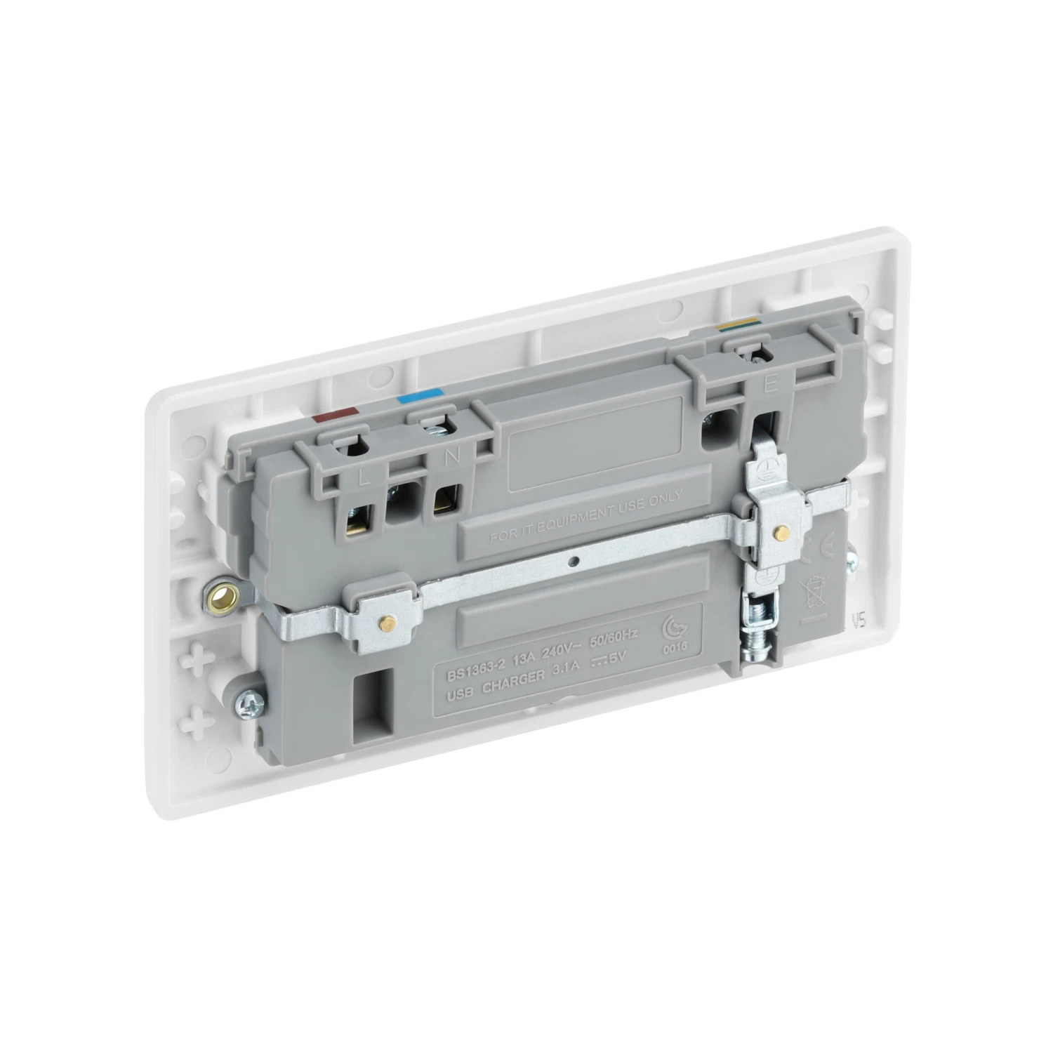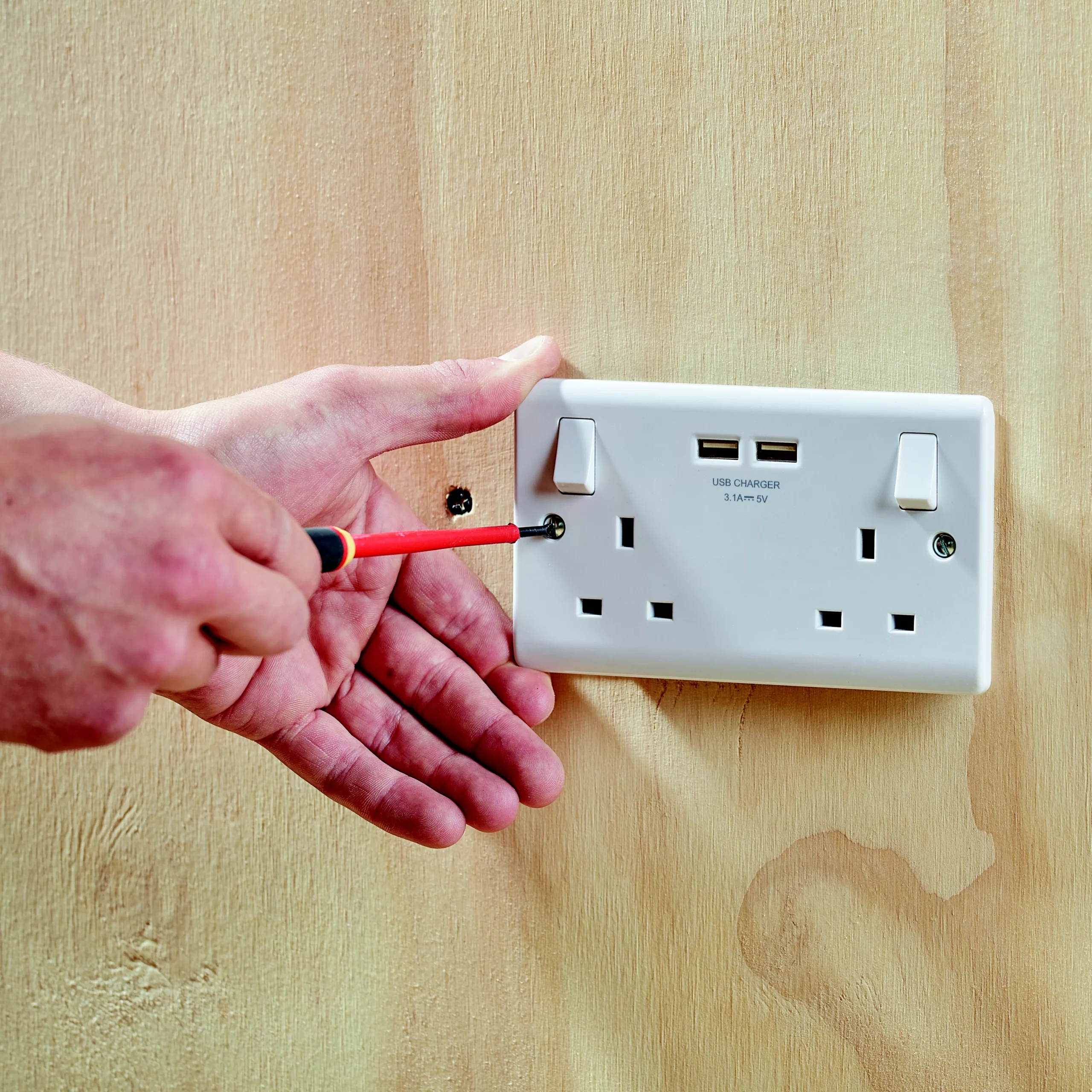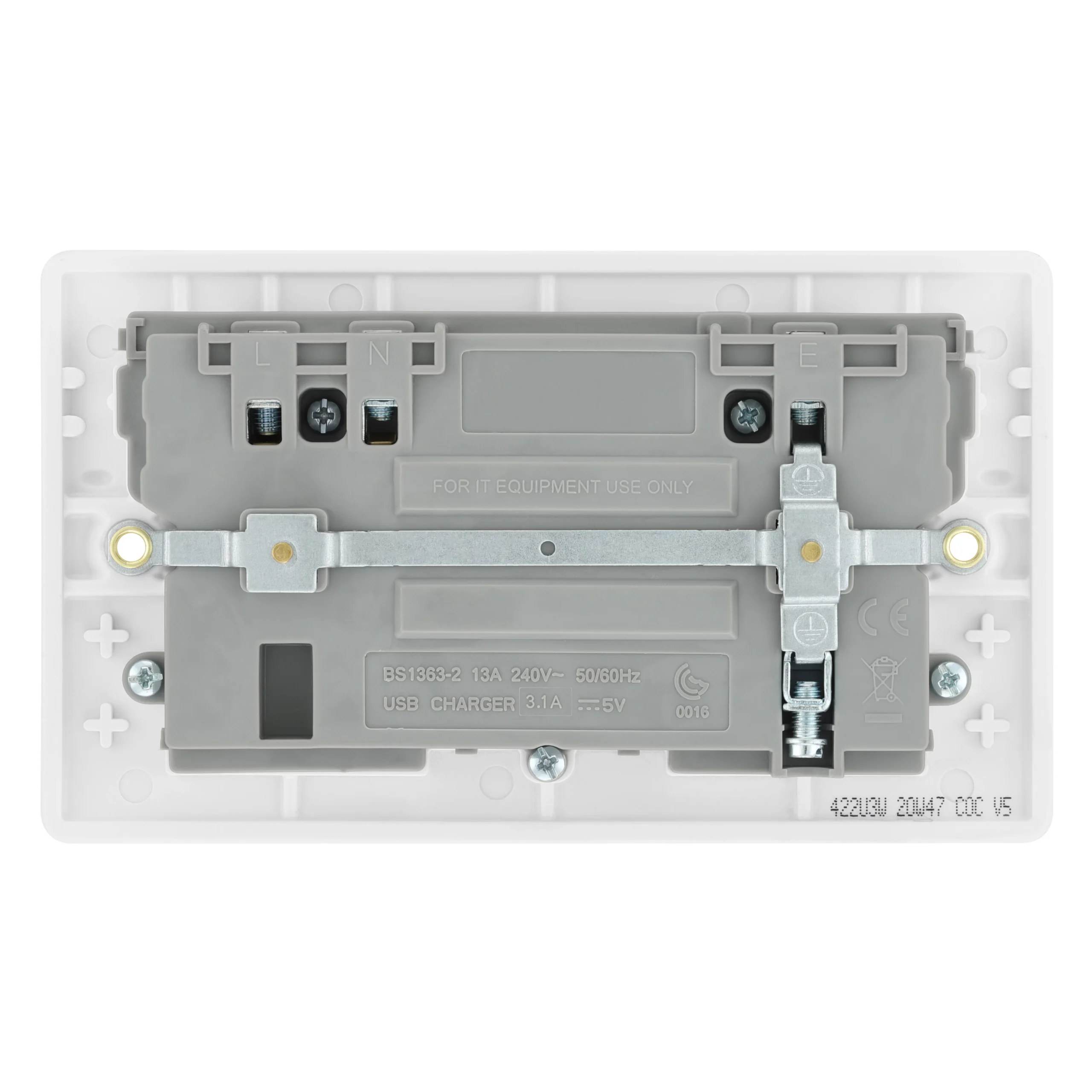 White moulded socket with 2 x USB charging ports. Ideal for charging iPads, iPhones, tablets, mobiles, cameras, MP3s and many more devices.