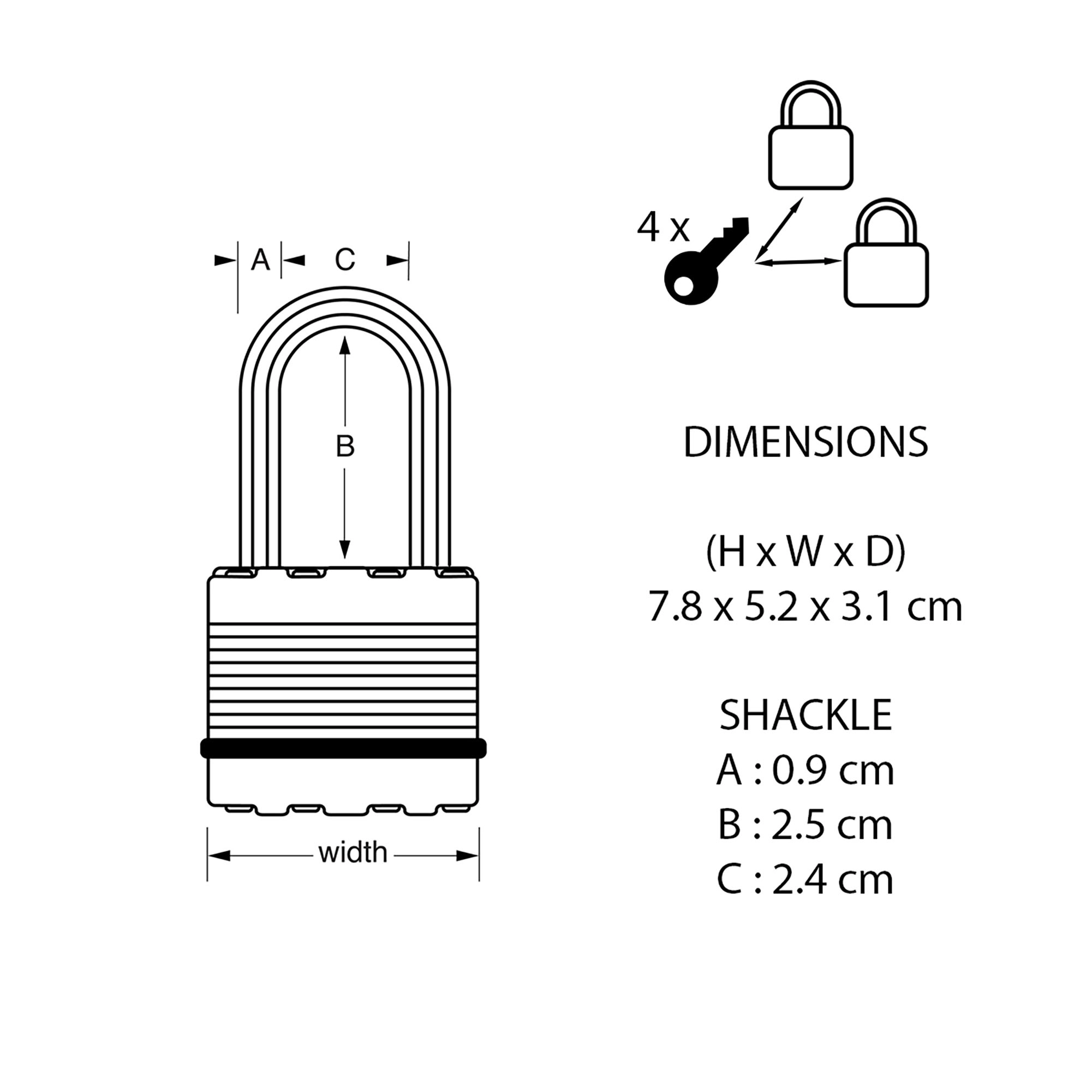 The Master Lock Excell No. M5EURT Laminated high security padlock is best used for storage units, sheds, garages, fences and more. The package contains 2 padlocks and 4 keys, key lock is the same for the two padlocks.