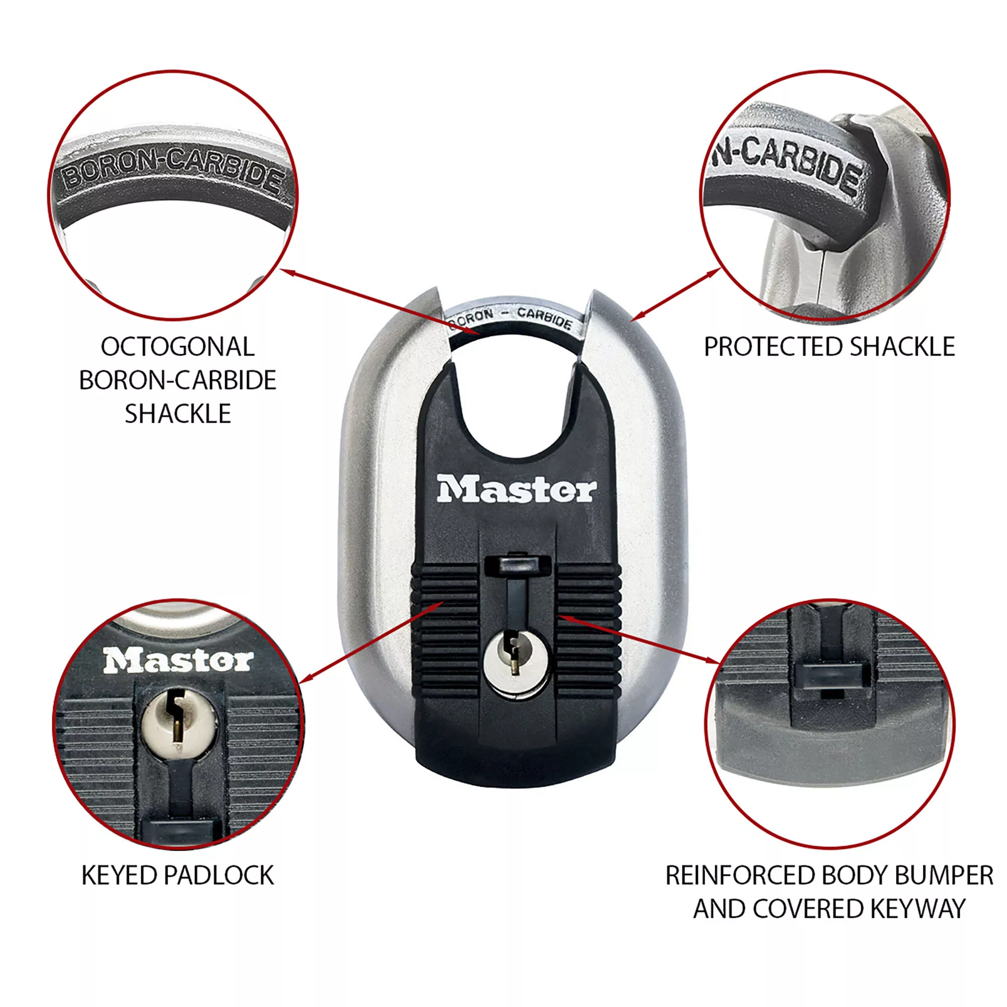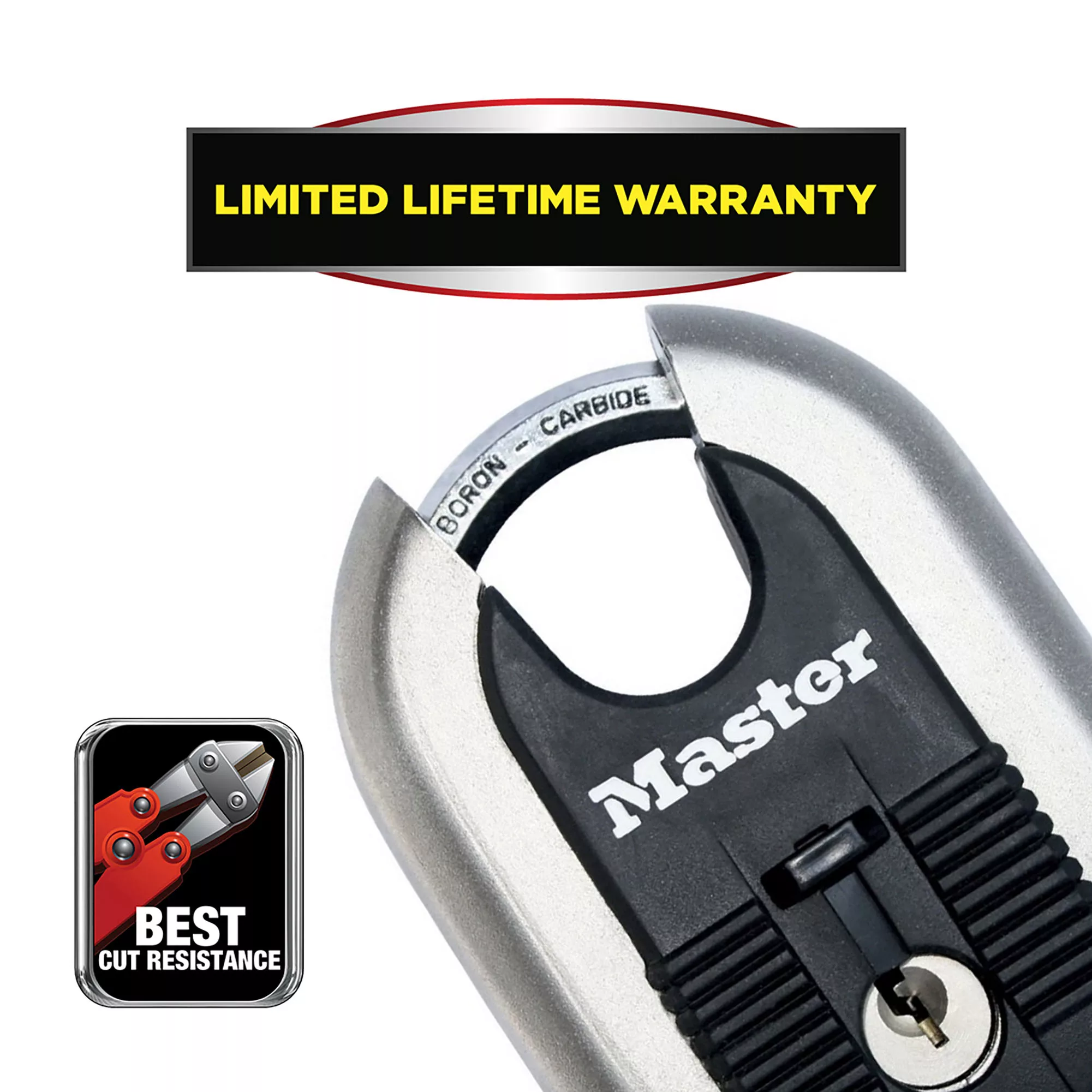 - The fully shrouded design minimizes shackle exposure and protects against bolt cutter attacks.