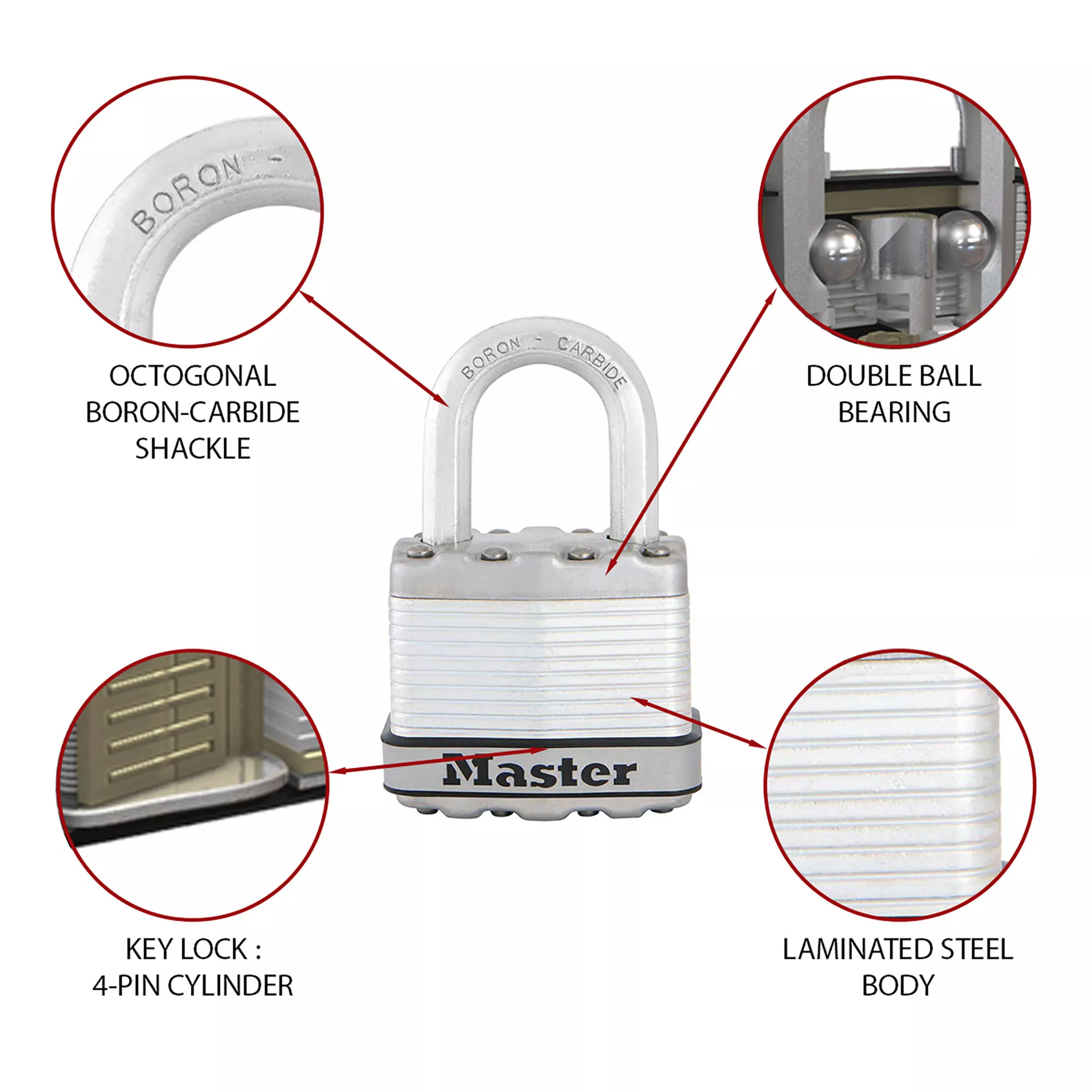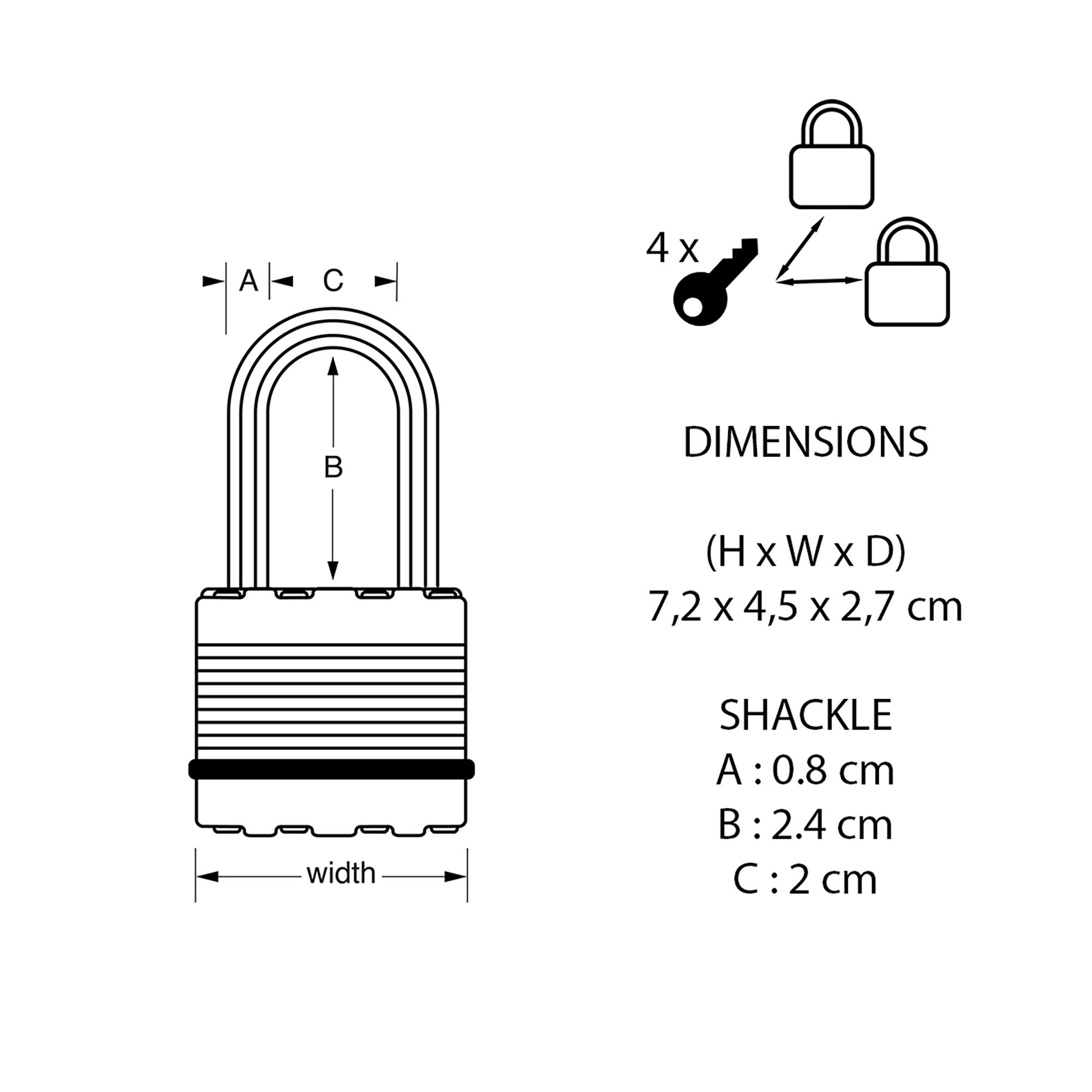 The Master Lock Excell® No. M1EURT Laminated high security padlock is best used for storage units, sheds, garages, fences and more. The package contains 2 padlocks and 4 keys, key lock is the same for the two padlocks. The Limited Lifetime Warranty provides peace of mind from a brand you can trust.