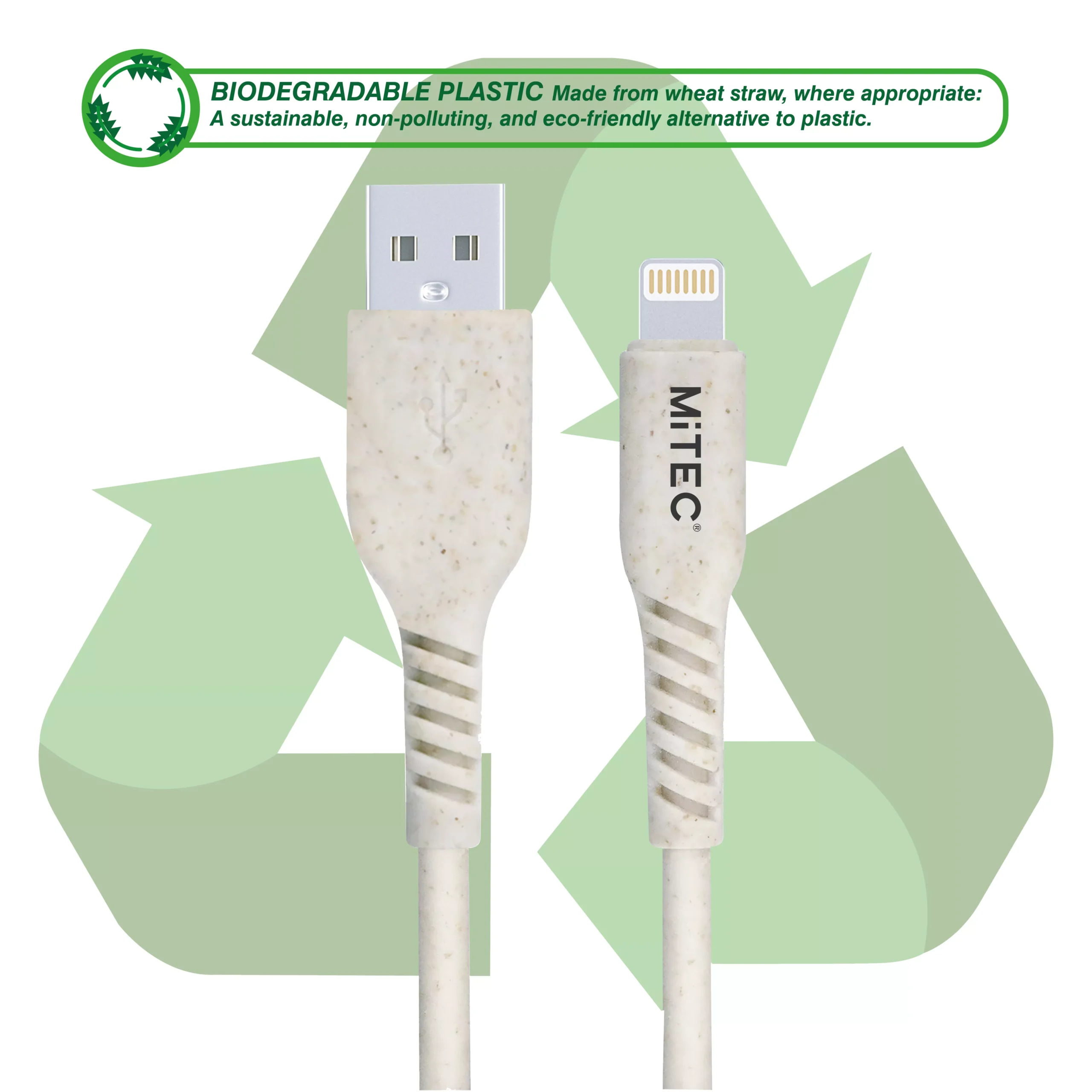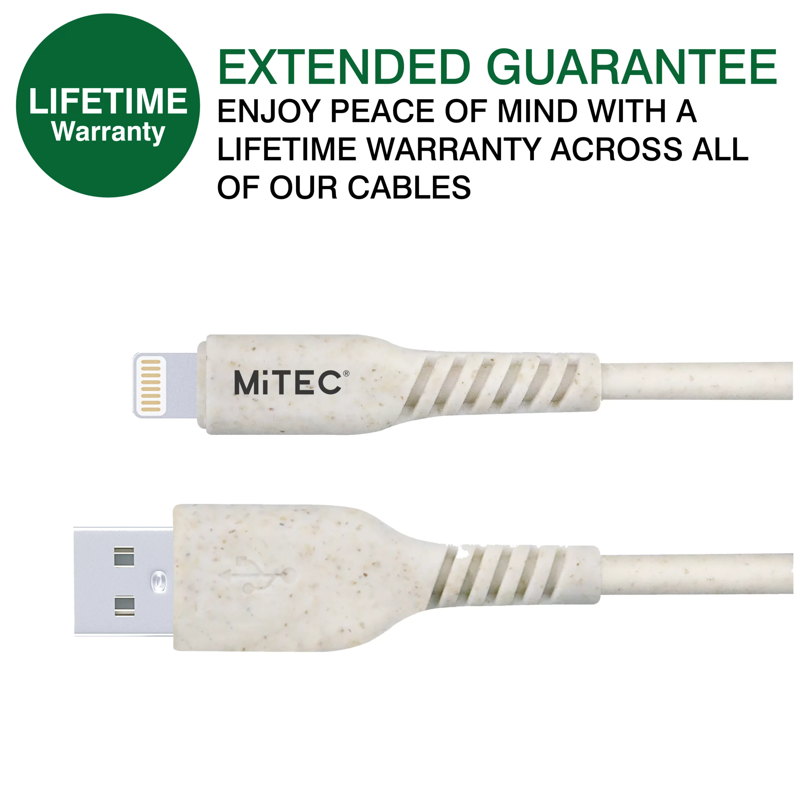 Power your world, without harming ours; Our Biodegradable Lighting to USB-A Charge/Sync cable is your eco-friendly essential! This cable is made from wheat straw, a sustainable alternative to plastic, that does not compromise on quality. Once landfilled, this material will naturally break down, and will not cause environmental harm, or produce any microplastics. Not only this, but our ‘Greenshoots’ packaging is 100% recyclable, biodegradable, and plastic free, helping to reduce to volume of plastic waste sent to landfill. Normal Anti-Split housing is tested with a pull and twist technique 10,000 times, but MiTEC Anti-Split housing, however, is tested 20,000 times and is designed to protect the cable housing as it connects to the plug.