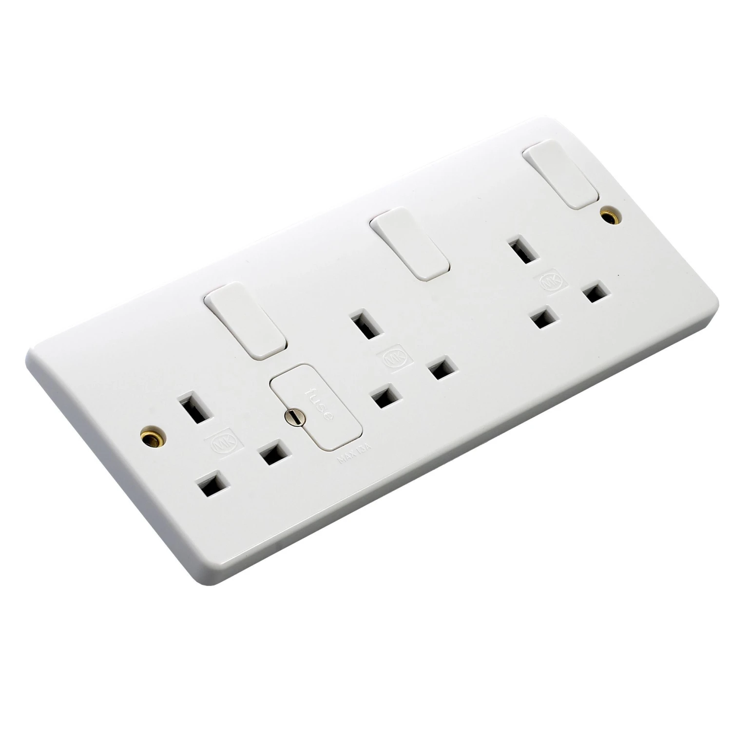 Raised screwed profile socket with plastic white finish. 13A, triple pole, 3-gang switched socket with outboard rockers and dual earth terminals.