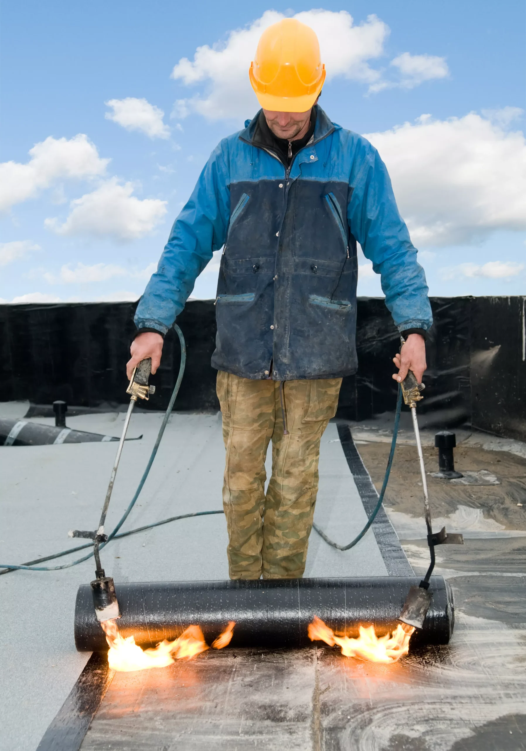 Roof pro Black Torch-on cap sheet membranes are rolled and applied hot, using a propane torch to heat the underside, which releases the molten bitumen to provide adhesion to a flat roof.