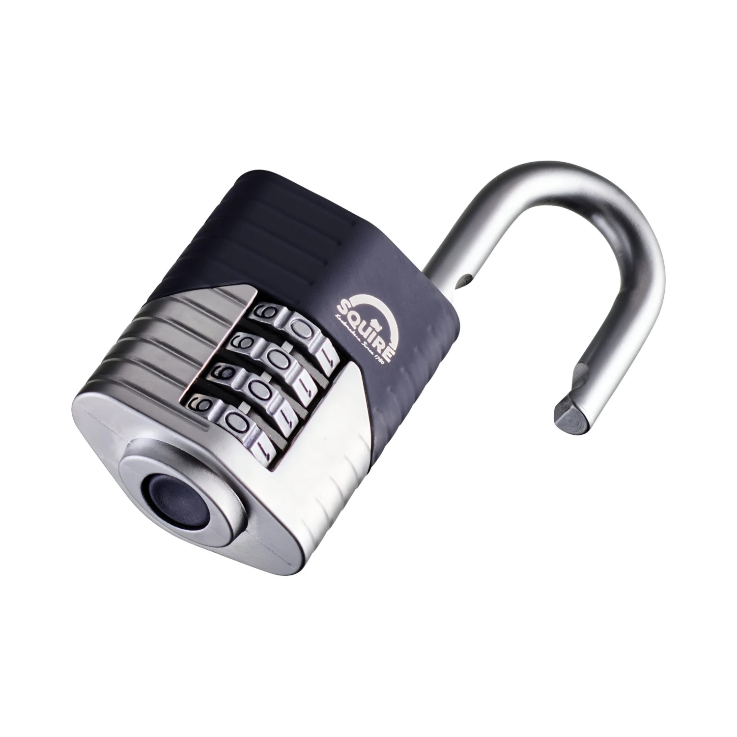 Die-cast steel body with soft-feel cover and hardened boron steel shackle. Re-code with up to 10,000 possible combinations.