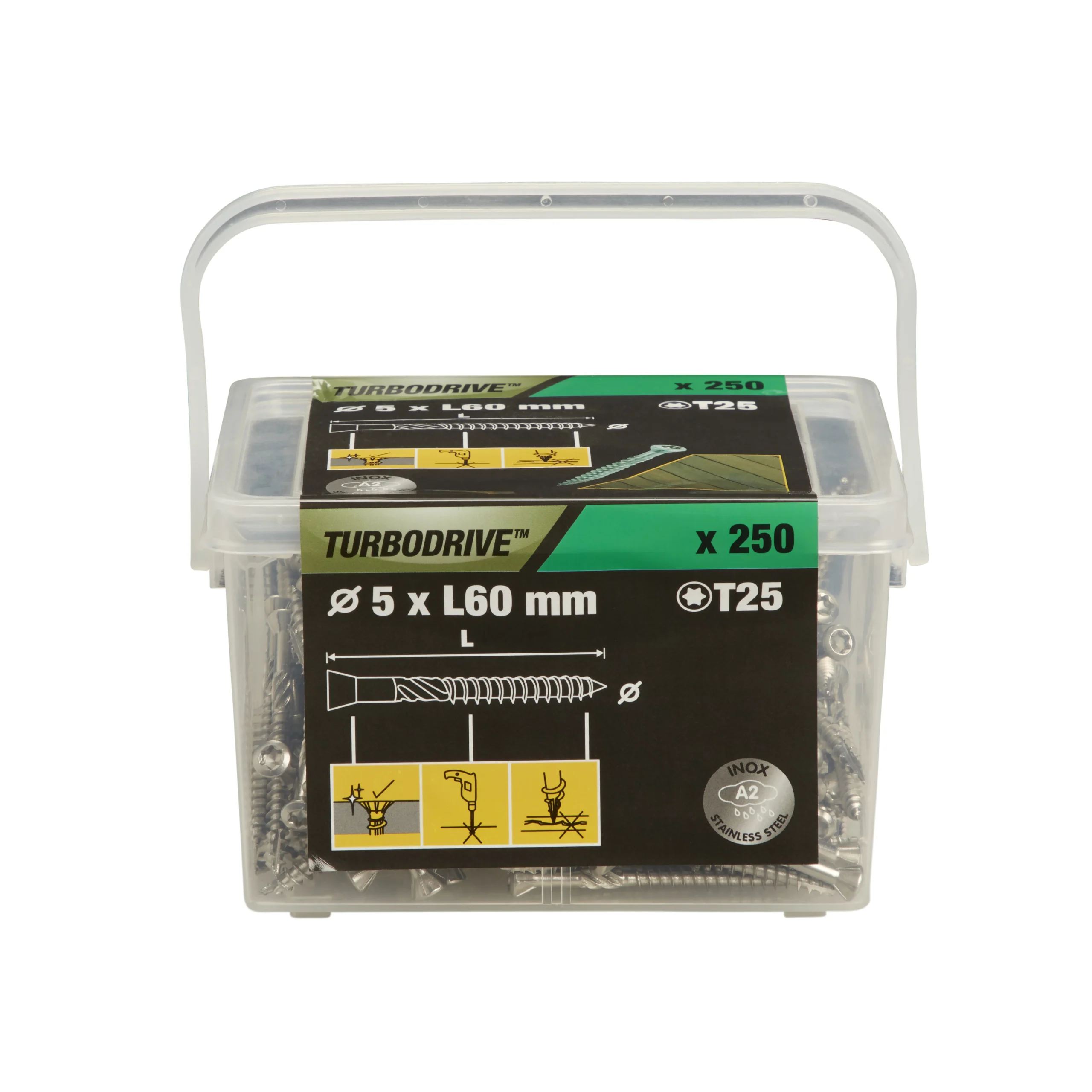 This pack of 250 shallow countersunk decking screws are constructed from durable stainless steel. They are 60mm in length, have a 5mm diameter. Recommended for outdoor use. This pack is ideal for a range of DIY projects.