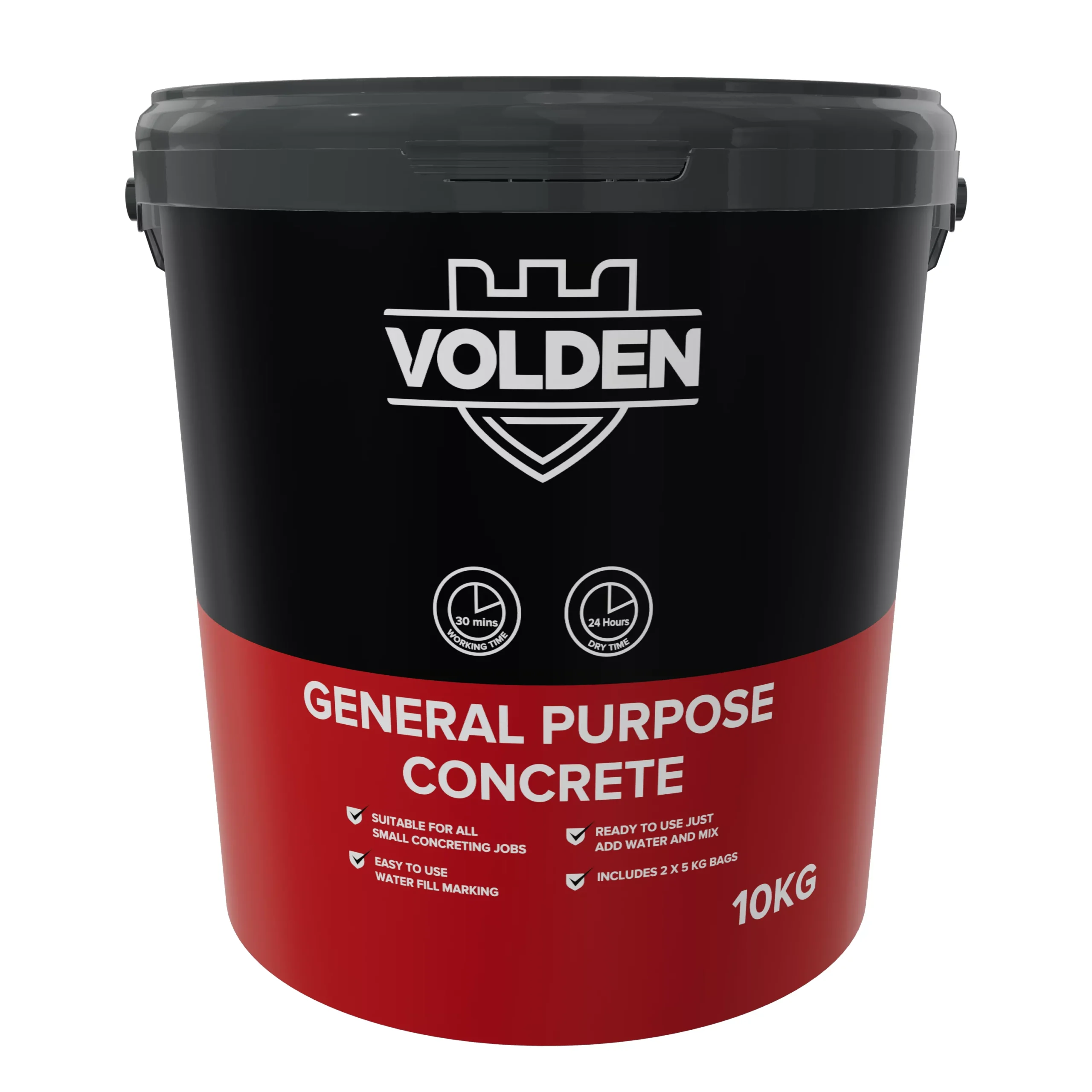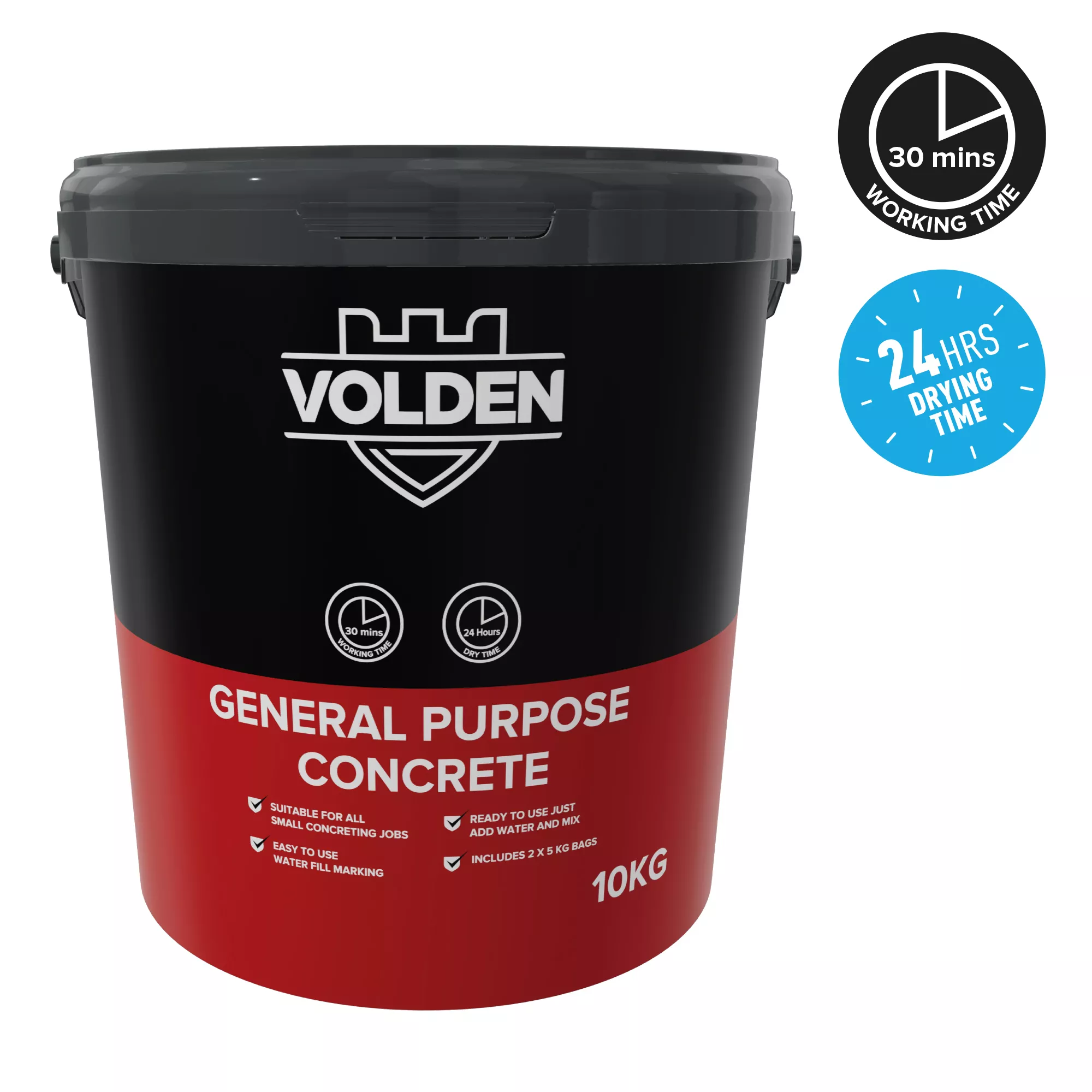 Volden General purpose concrete is a premix of cement, sand and aggregate often used for paths, drives, foundations and general concrete work. Comes with 2 x 5kg bags to allow you to mix for multiple jobs on different days