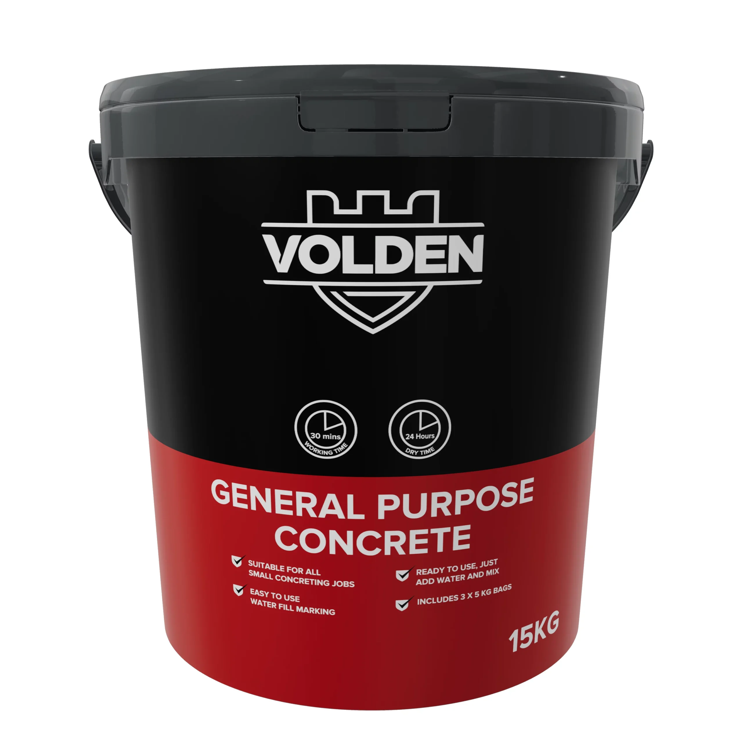 Volden General purpose concrete is a premix of cement, sand and aggregate often used for paths, drives, foundations and general concrete work. Comes with 3 x 5kg bags to allow you to mix for multiple jobs on different days